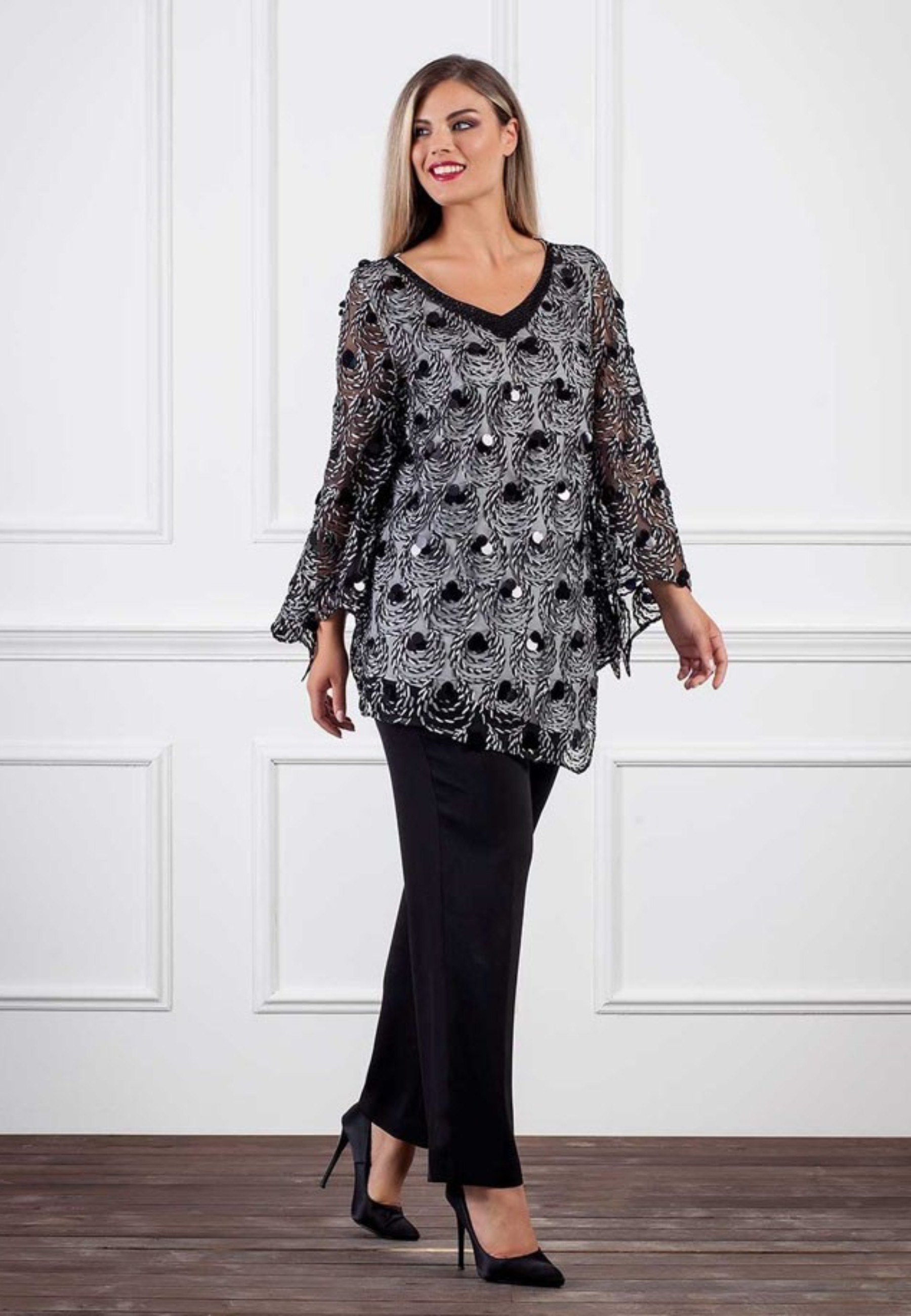 Un outfit sofisticato che unisce eleganza e modernità. La casacca, realizzata in tulle leggero e impreziosita da un ricamo con maxipaillettes, regala luce e movimento al look, diventando la protagonista assoluta del coordinato. Il pantalone in tinta unita nera, dalla linea pulita e fluida, bilancia l'ensemble con sobrietà e raffinatezza. Perfetto per cerimonie, eventi serali o occasioni speciali dove lo stile fa la differenza.