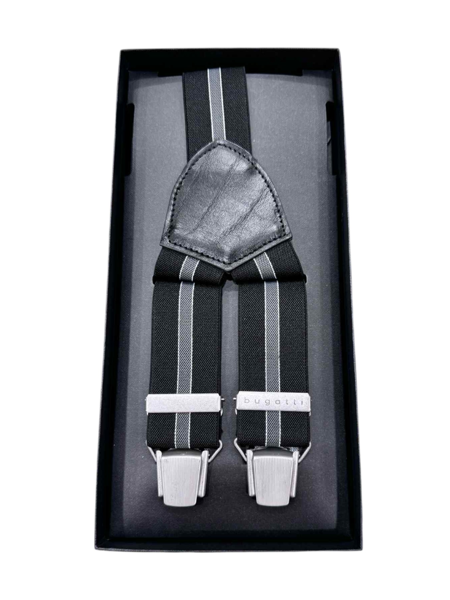 Le bretelle Bugatti con riga centrale combinano comfort e stile: l'elastico flessibile, l’elegante dettaglio in pelle al centro e la fantasia a righe le rendono un accessorio versatile e raffinato, perfetto per contesti formali o momenti di stile casual sofisticato.