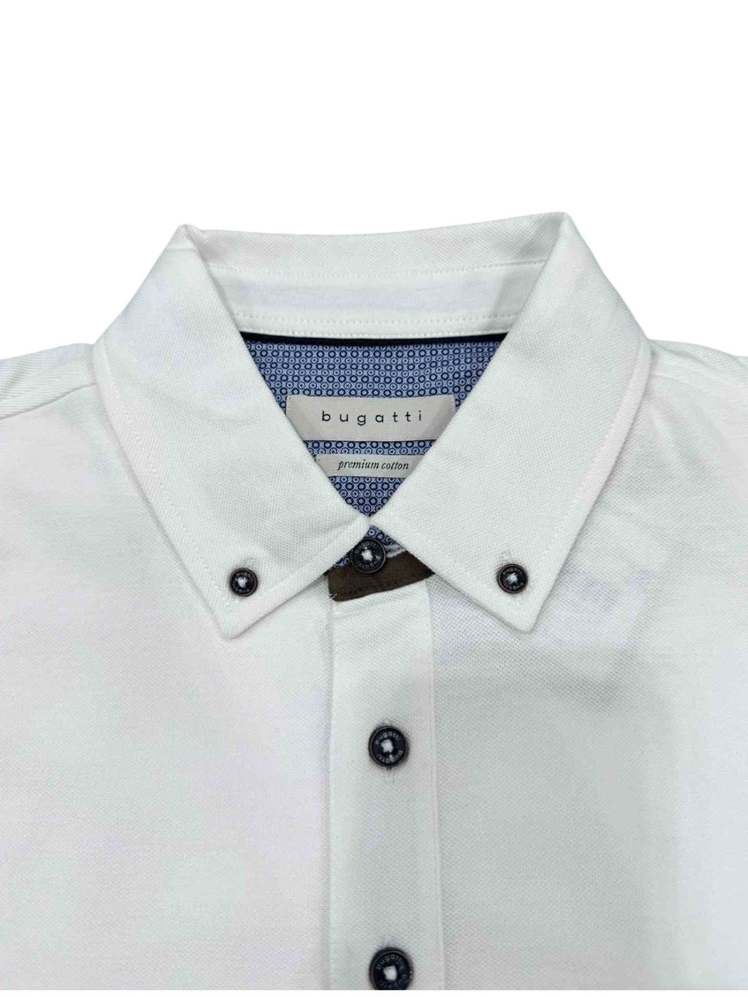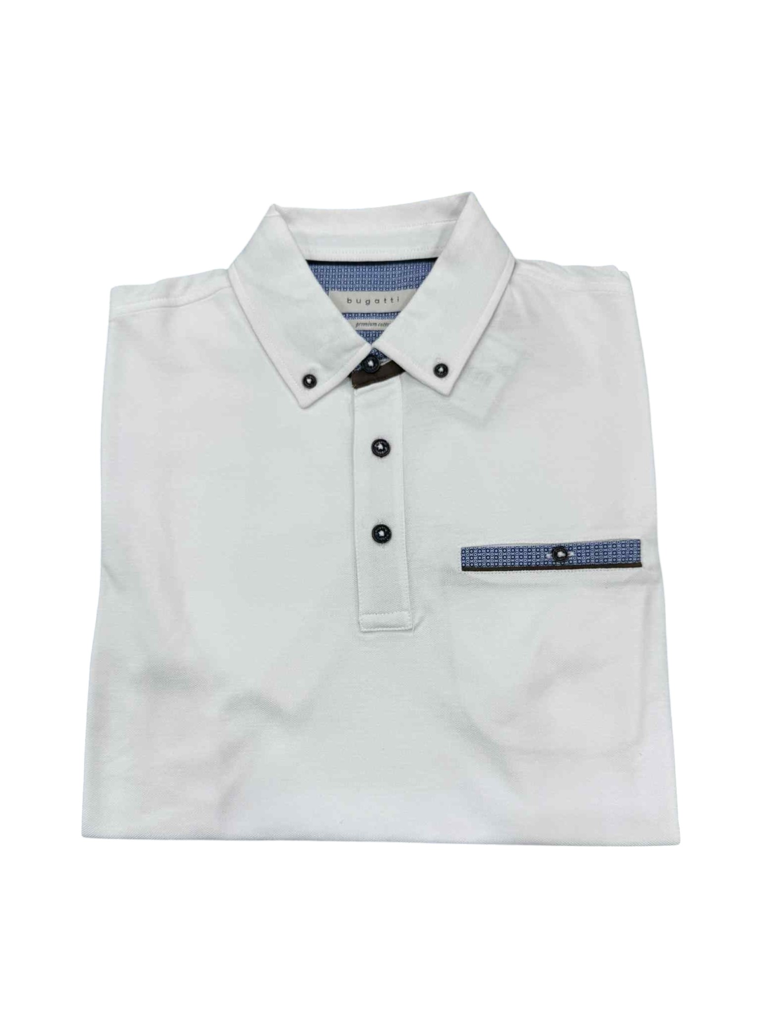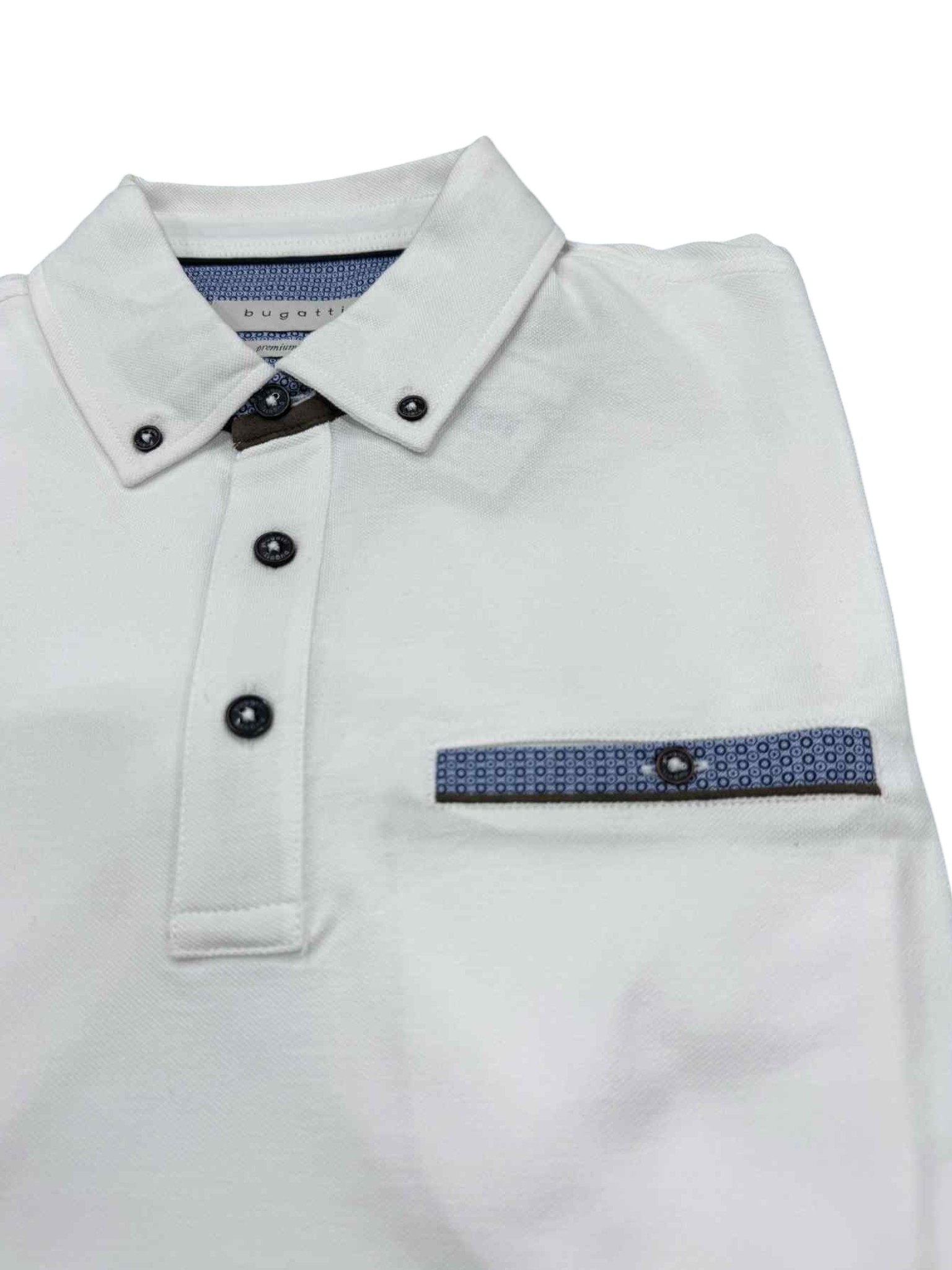 Raffinata e dal gusto contemporaneo, questa polo Bugatti incarna l'equilibrio tra eleganza e praticità. Il bianco luminoso valorizza la linea pulita del capo, mentre il colletto con bottoni dona un tocco di struttura e versatilità. Il dettaglio distintivo è il taschino sul petto, impreziosito da una delicata rifinitura in microfantasia, che aggiunge personalità con sobrietà. Perfetta per l'uomo che desidera uno stile curato, adatto sia al tempo libero che a contesti più formali con un tocco casual.