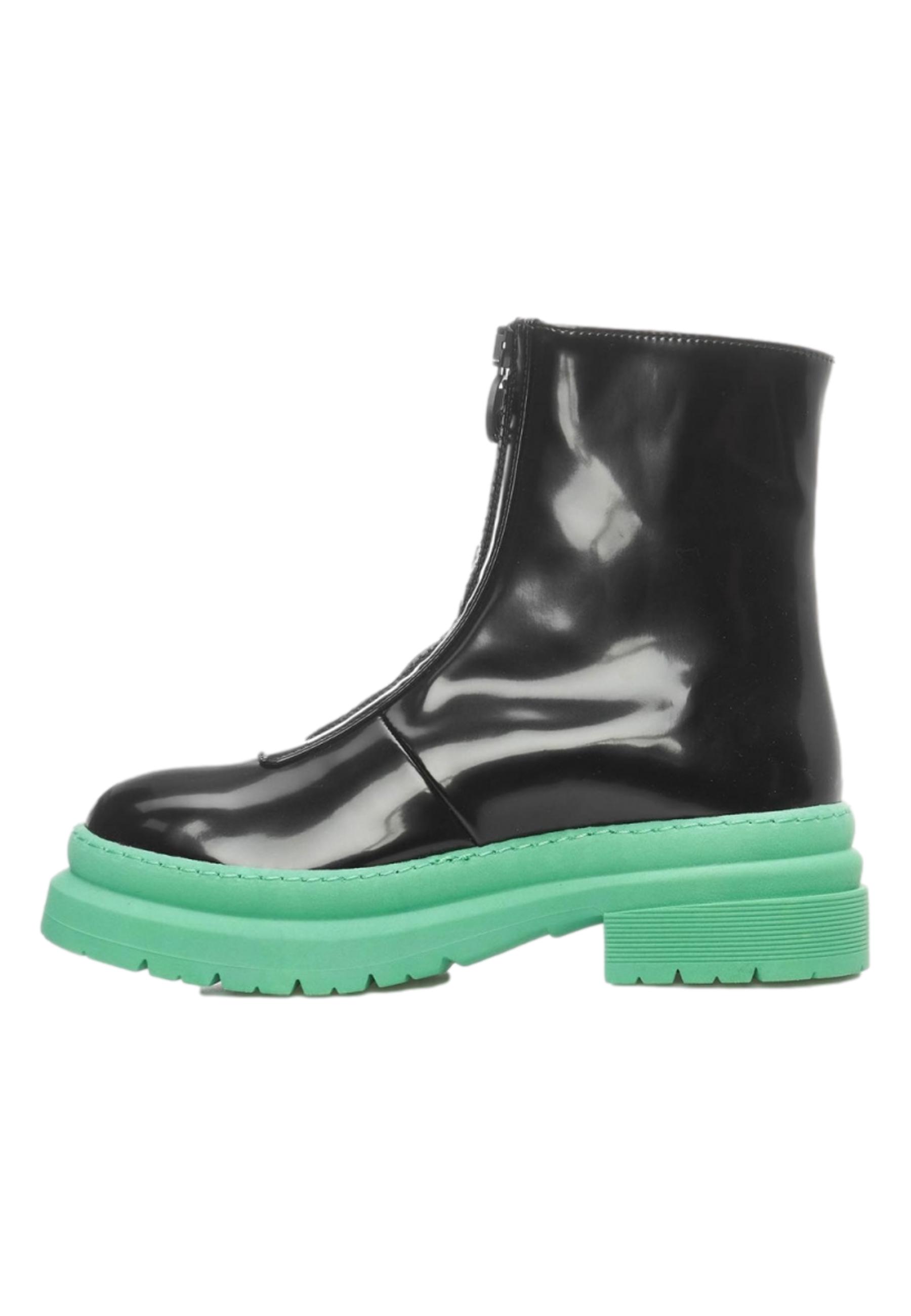 Nero/verde, pelle verniciata, design bicolore, punta smussata, chiusura frontale nascosta con zip e suola chunky in gomma.