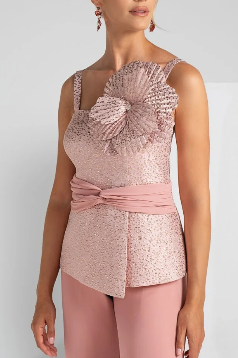 Un completo raffinato e di grande impatto, pensato per esaltare la femminilità con eleganza e leggerezza. Il pantalone in chiffon, fluido e impalpabile, accompagna i movimenti con grazia, creando un effetto etereo e sofisticato.