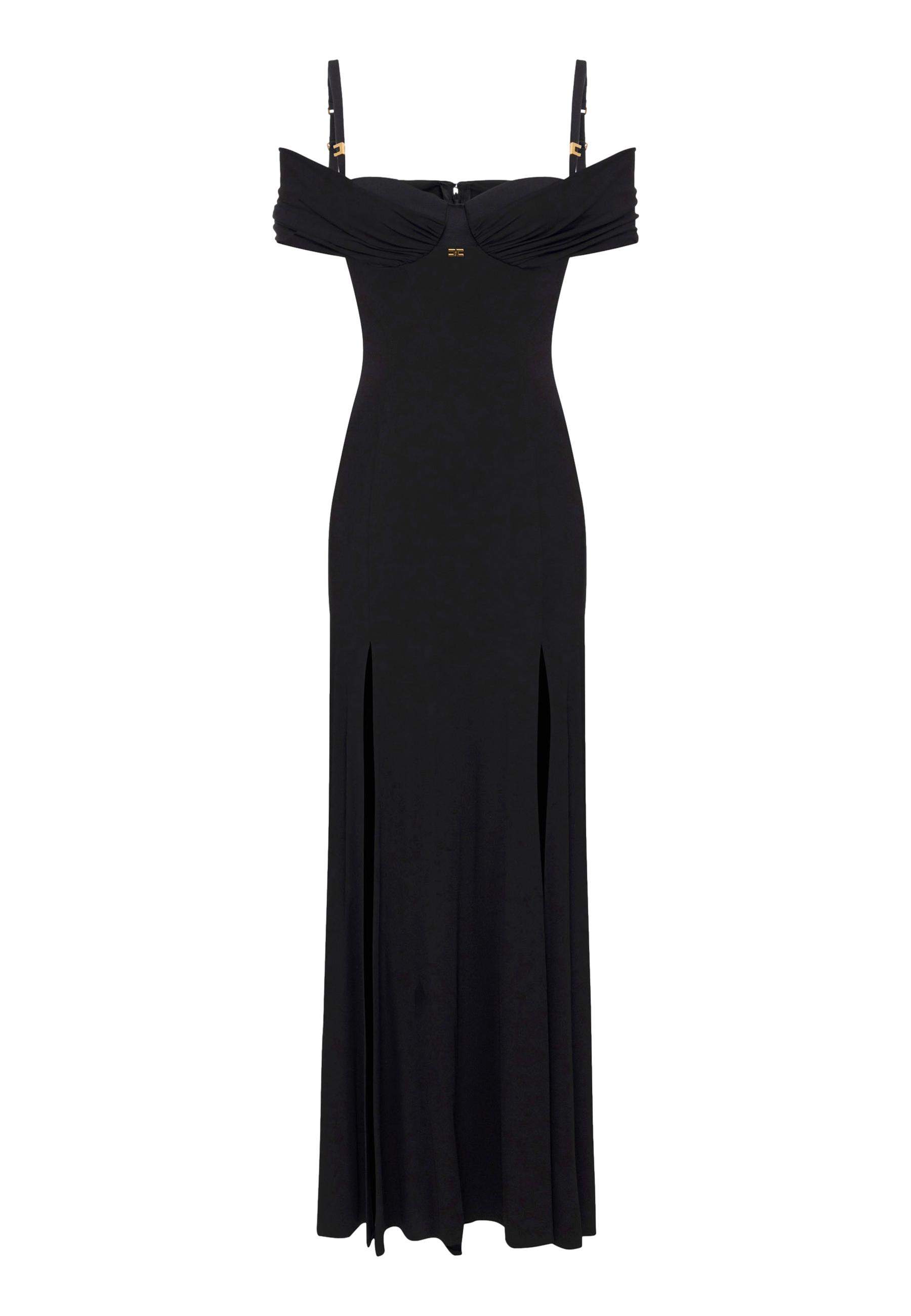 Abito da sera in jersey crêpe. L'abito presenta una costruzione a corsetto con spalline e coppe, incorniciata da un drappeggio sulle spalle. I passanti e il piccolo charm, entrambi con logo gioiello in metallo dorato, danno un tocco di luce. Gonna con doppio spacco.