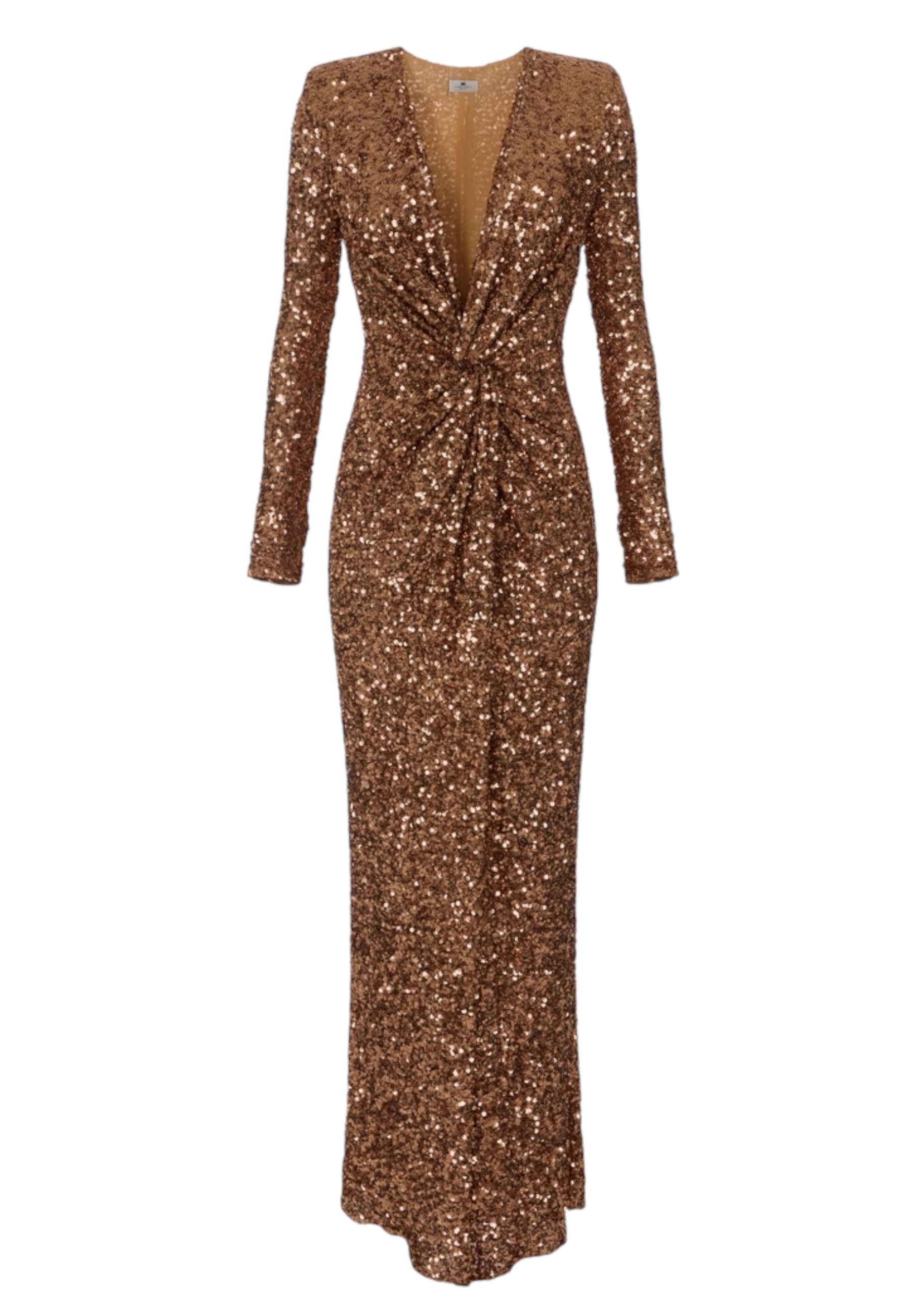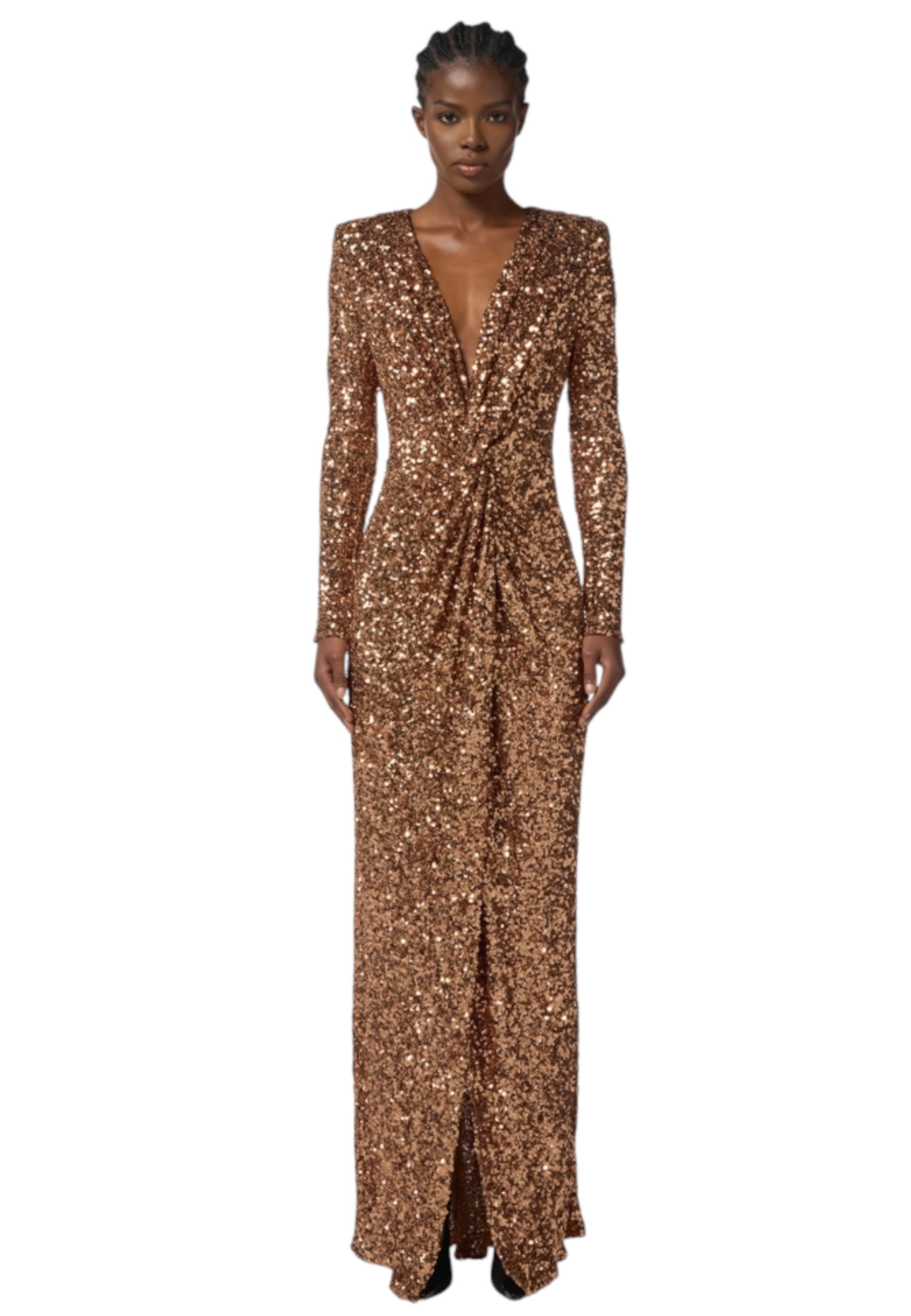 Abito da sera dalla vestibilità aderente. Il vestito ha spalle strutturate con scollo profondo e maniche lunghe. Protagonista è la texture in full paillettes che illumina tutta la lunghezza. Il nodo centrale crea drappeggi che abbracciano il punto vita. Lo spacco anteriore regala un'ultima nota audace.