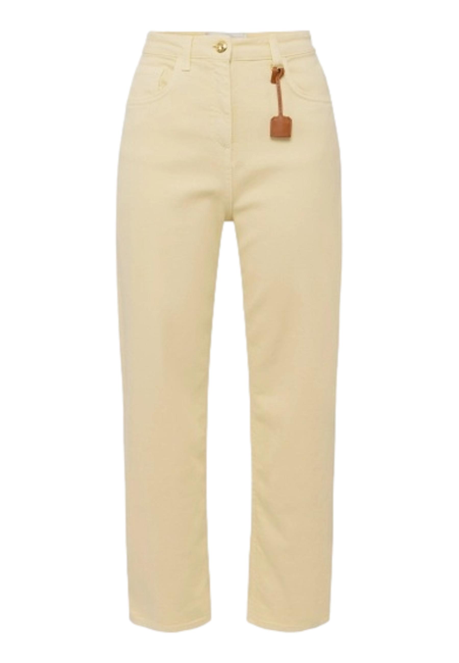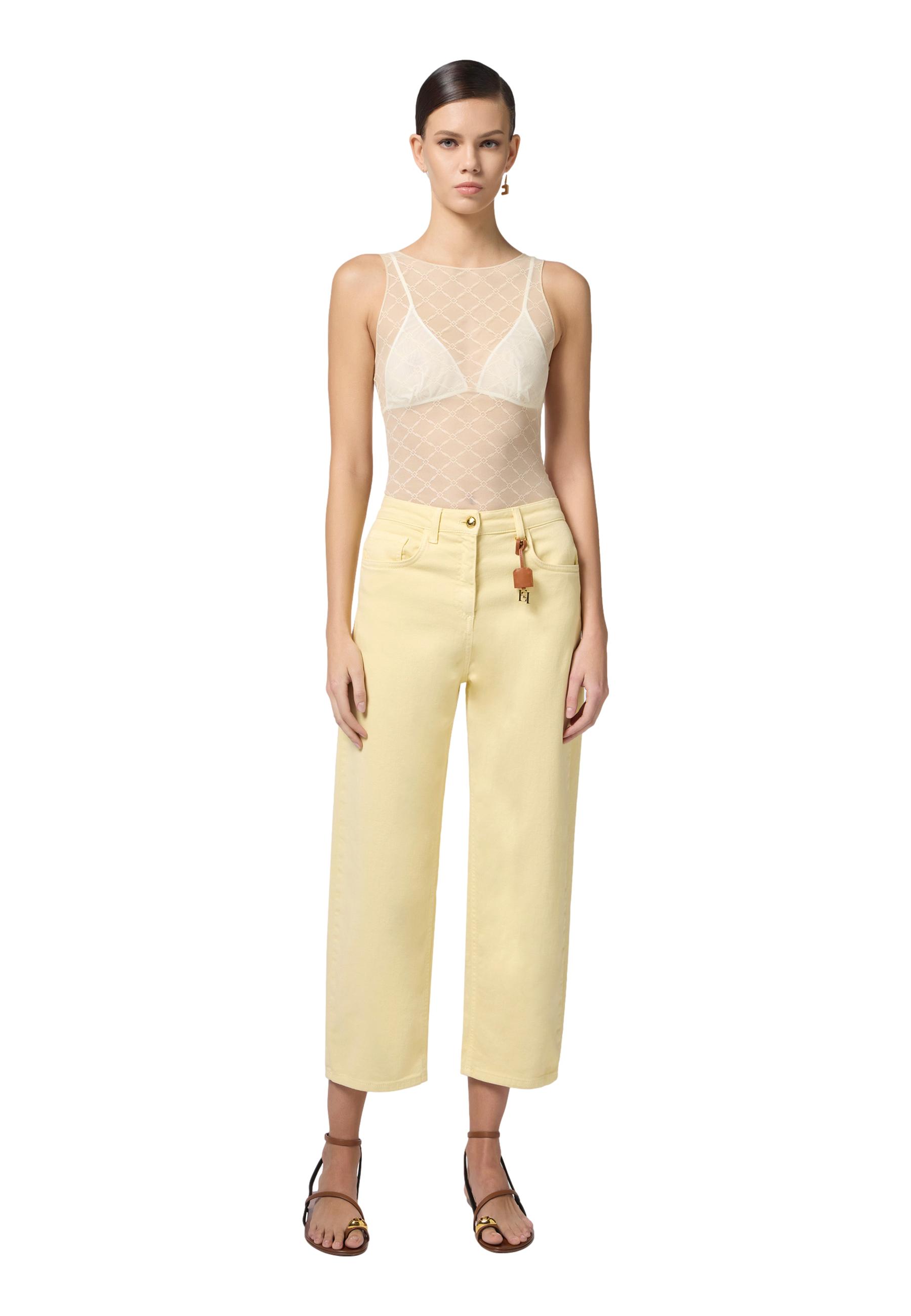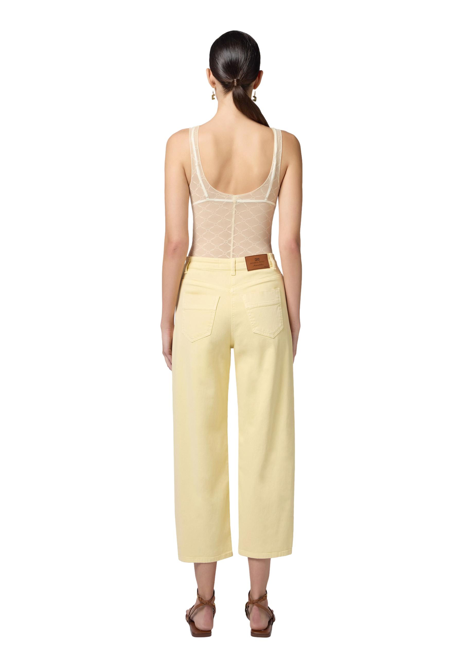 Pantaloni cinque tasche in cotone tinto capo costruiti con vita alta e gamba a palazzo.