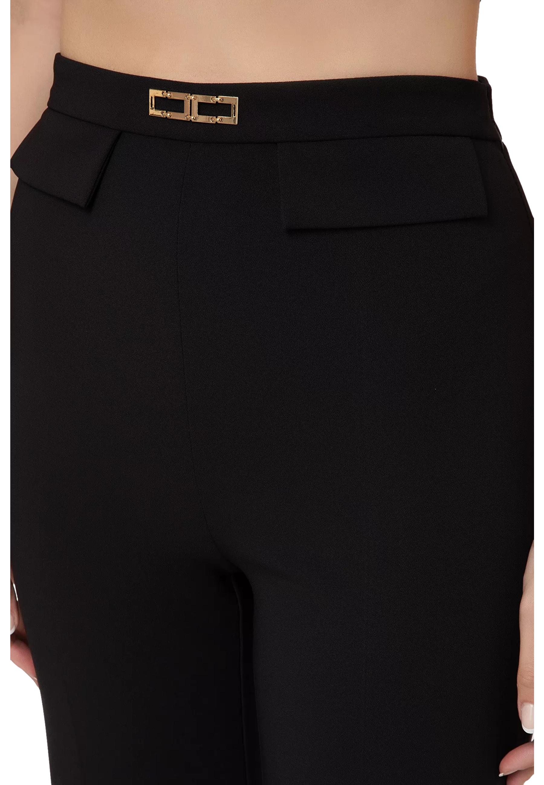 Pantalone in doppio crêpe stretch dalla vestibilità a palazzo con fascione in vita personalizzato da accessorio logo snodato in metallo oro, patte al di sotto del fascione e nervatura centro gamba.