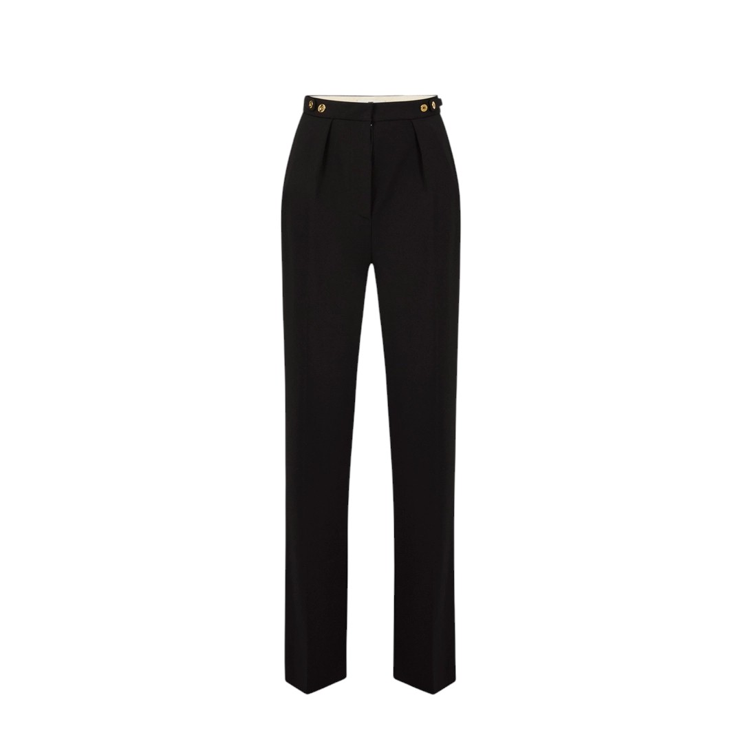 Pantaloni in crêpe dalla vestibilità regular. Con piega al centro e tasche alla francese, hanno dettagli in metallo dorato che impreziosiscono i fianchi e il retro della vita.