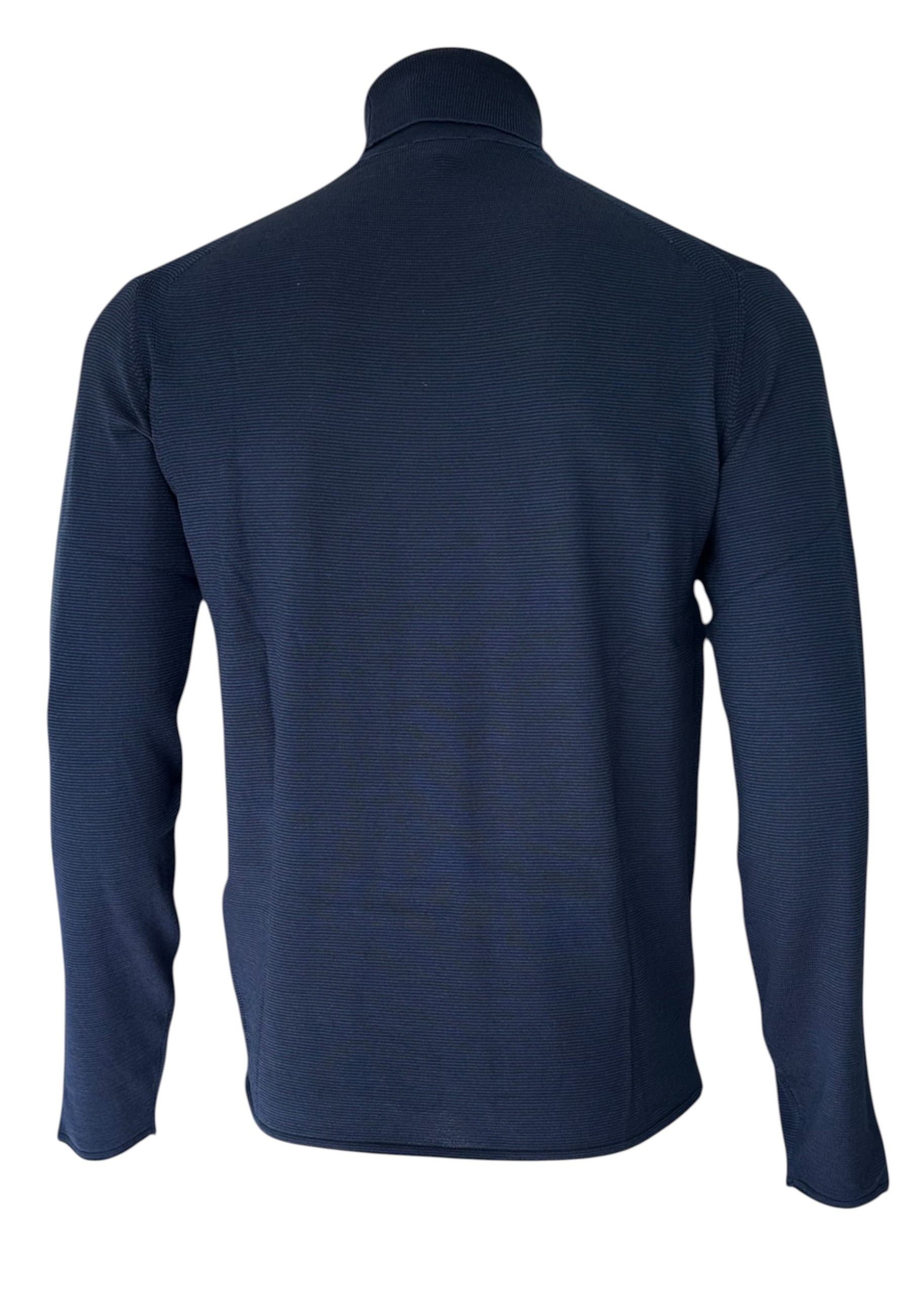 Maglione a collo alto con dettaglio sul collo e ricamo micro-aquila. Il jacquard ricamato crea un fitto motivo a micro-righe orizzontali bicolori.