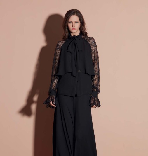 Il capo si distingue per il raffinato collo con fiocco e le maniche lunghe in pizzo trasparente con polsini a volant, che creano un look sofisticato e femminile.