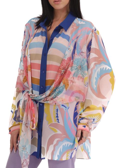 Camicia in chiffon fantasia multicolor con applicazioni e finta abbottonatura sul davanti