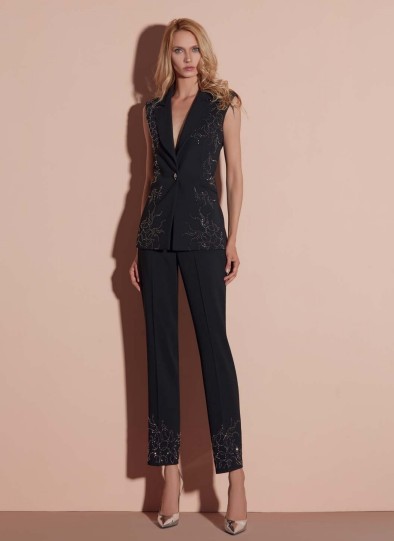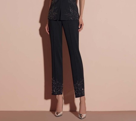 Pantalone elegante in tessuto fluido con raffinato ricamo floreale argento sul fondo.