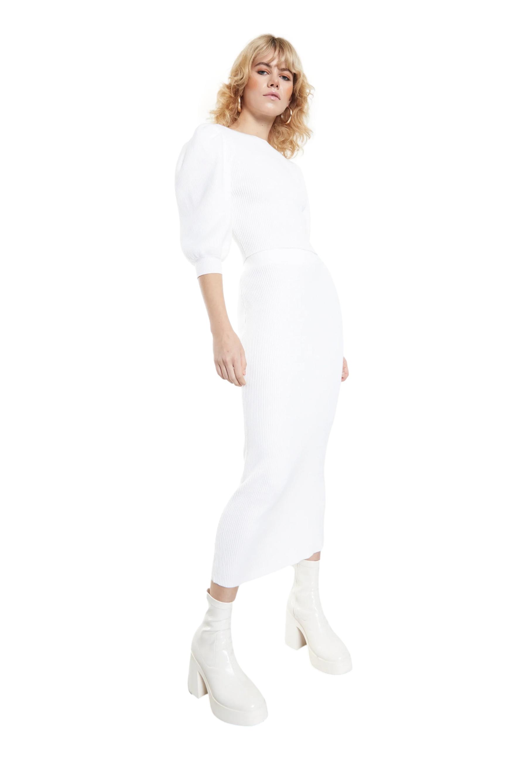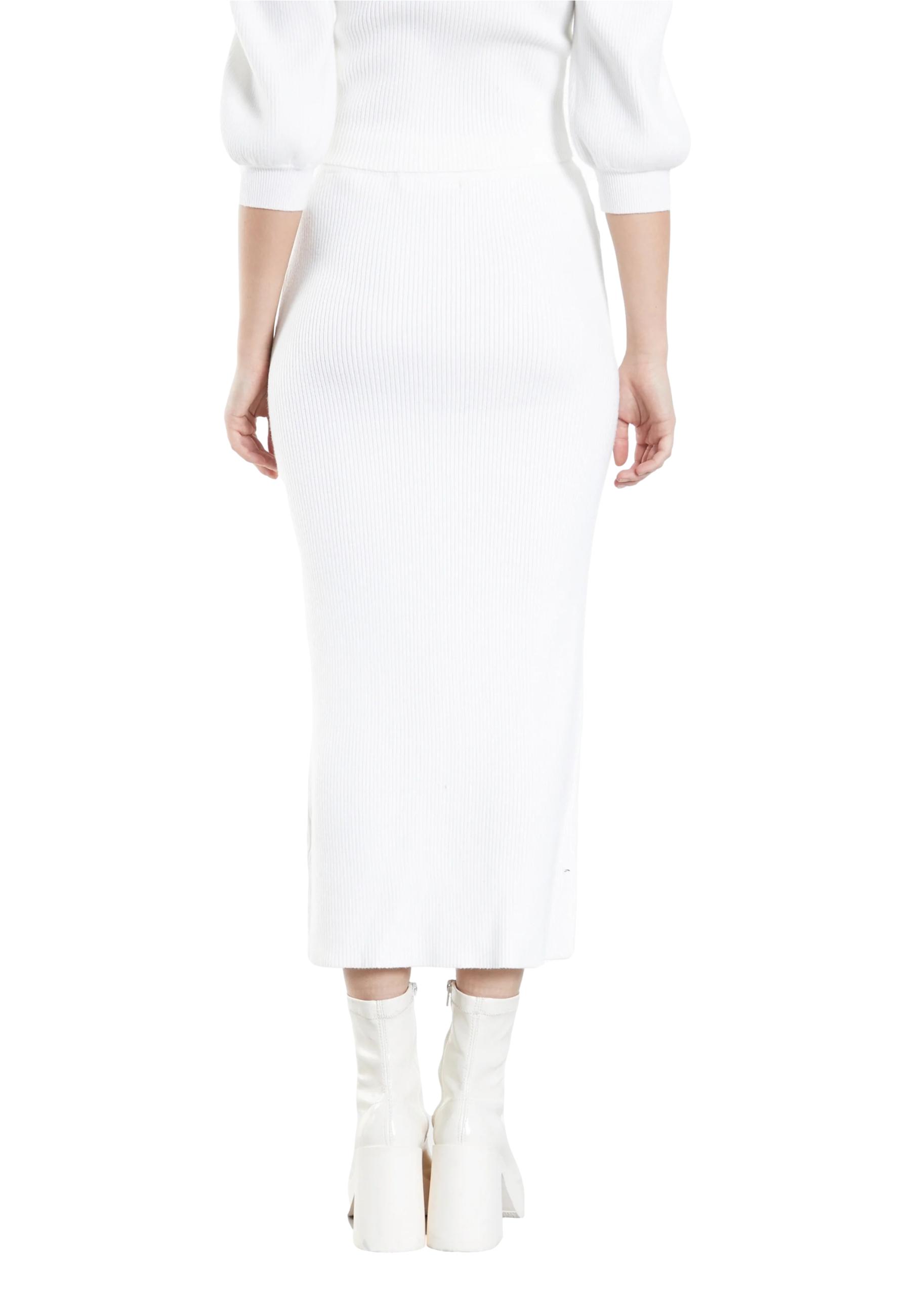 Gonna midi in maglia bianca glamour. Questa gonna midi è perfetta per il vostro guardaroba autunnale. Abbinatela al maglione coordinato e agli stivali con tacco per un look perfetto e di tendenza.
