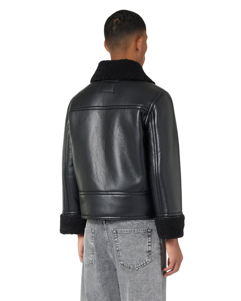 Questo giubbotto aviator fit in ecomontone nero combina calore e stile contemporaneo, grazie allinterno accoppiato in pile ricciolino visibile su collo e polsi.