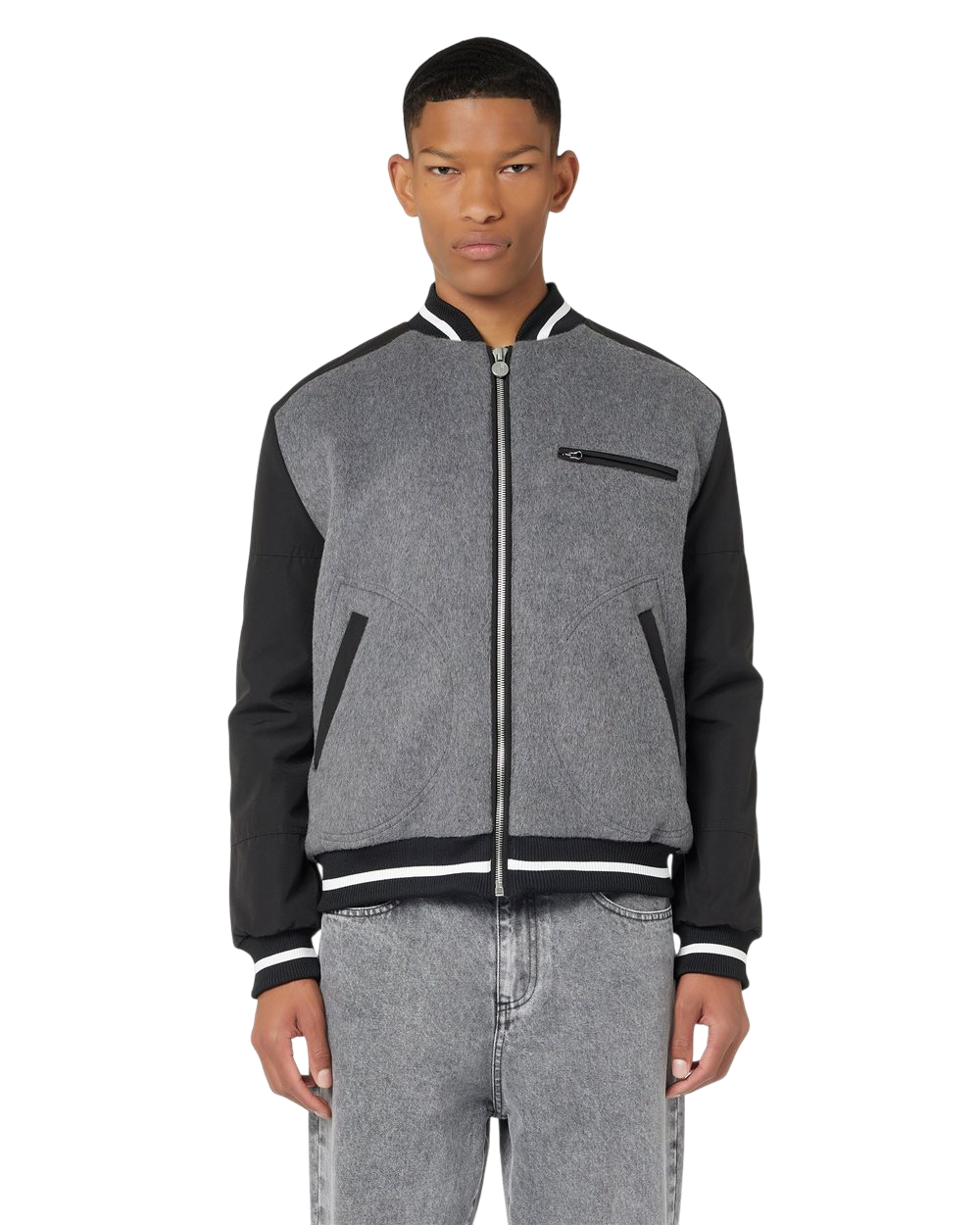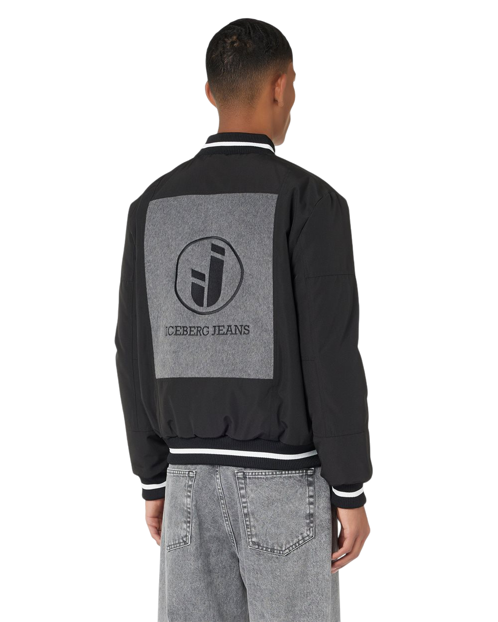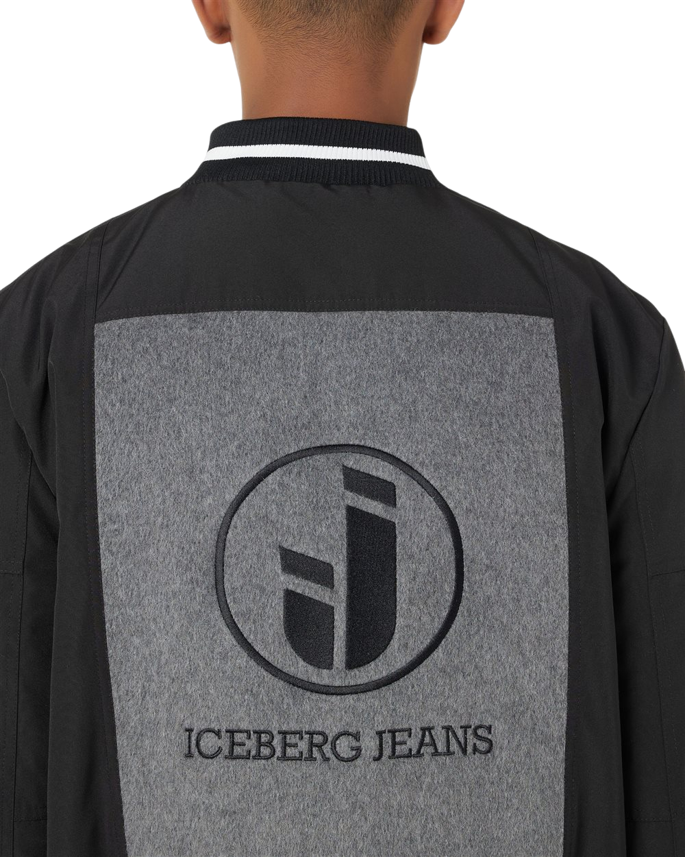 Varsity jacket in panno misto lana nero e grigio con inserti nylon cordura e logo Iceberg Jeans