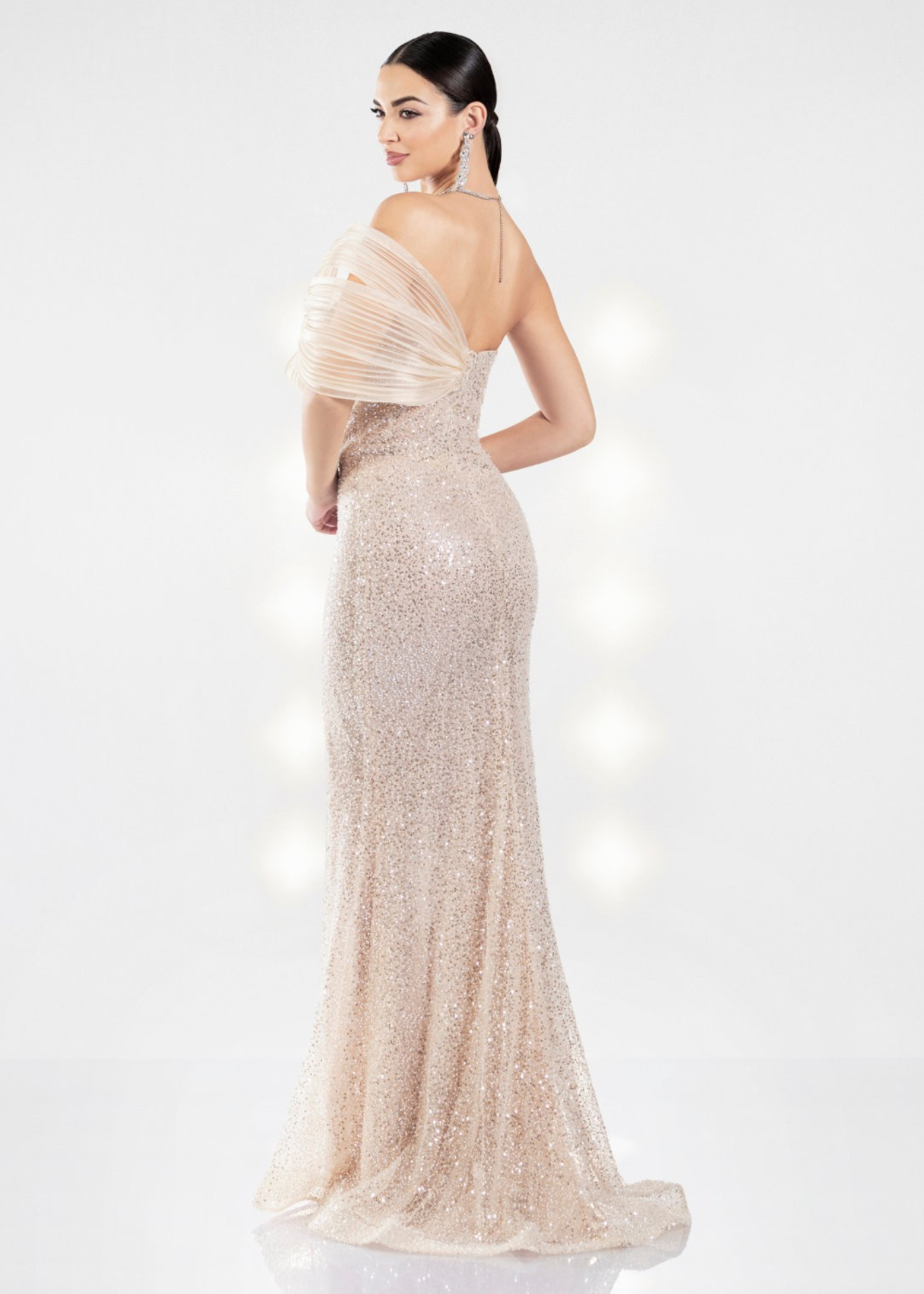 Abito a sirena firmato Impero Couture, caratterizzato da una lavorazione ricercata e interamente realizzata con grande attenzione ai dettagli.