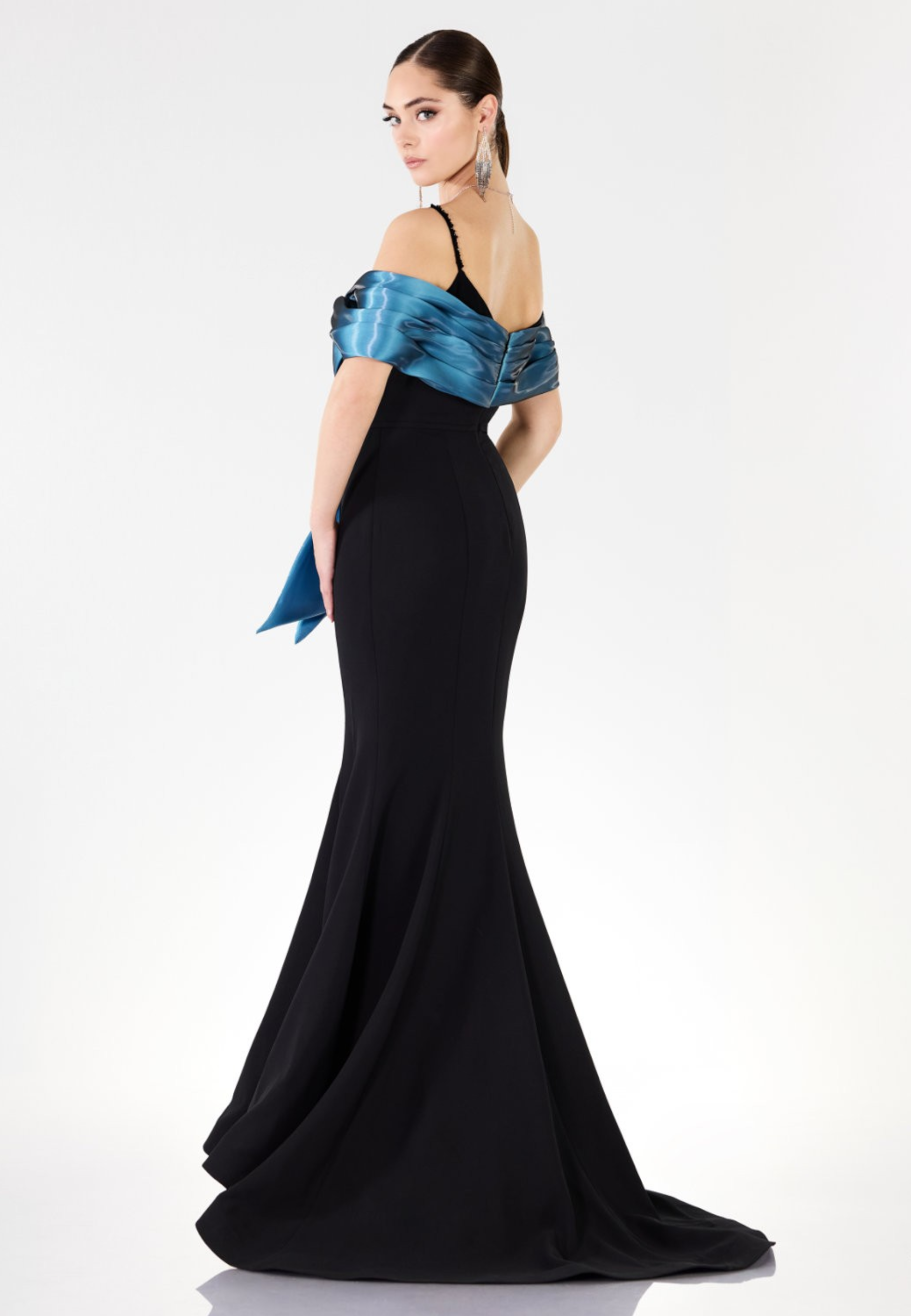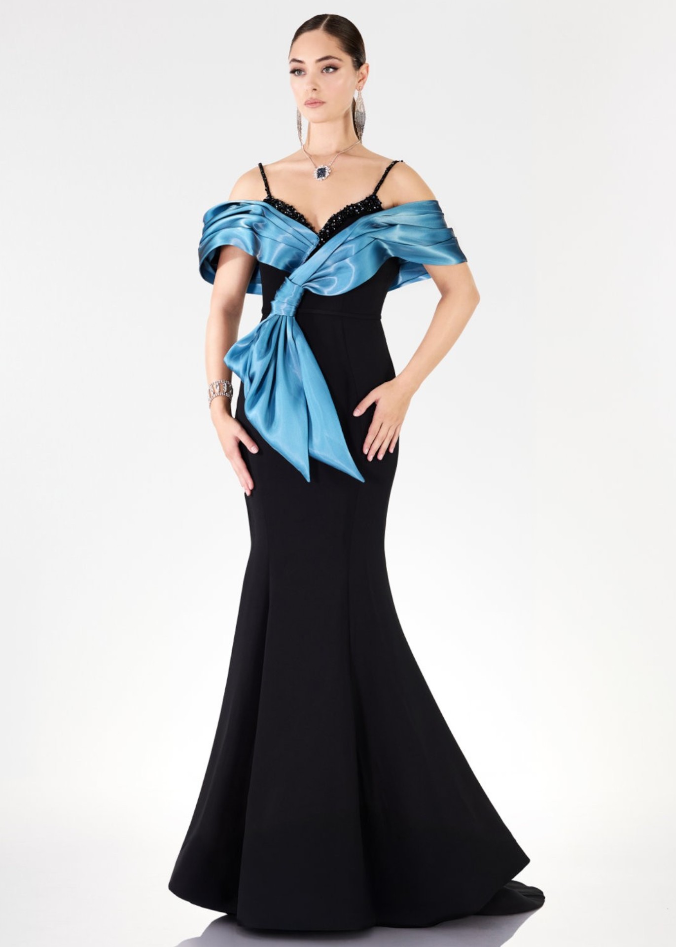 Il modello è impreziosito da un originale effetto di tessuto annodato a contrasto, realizzato in tessuto cangiante, che dona luminosità e movimento al capo, creando un gioco di texture e riflessi di grande fascino.