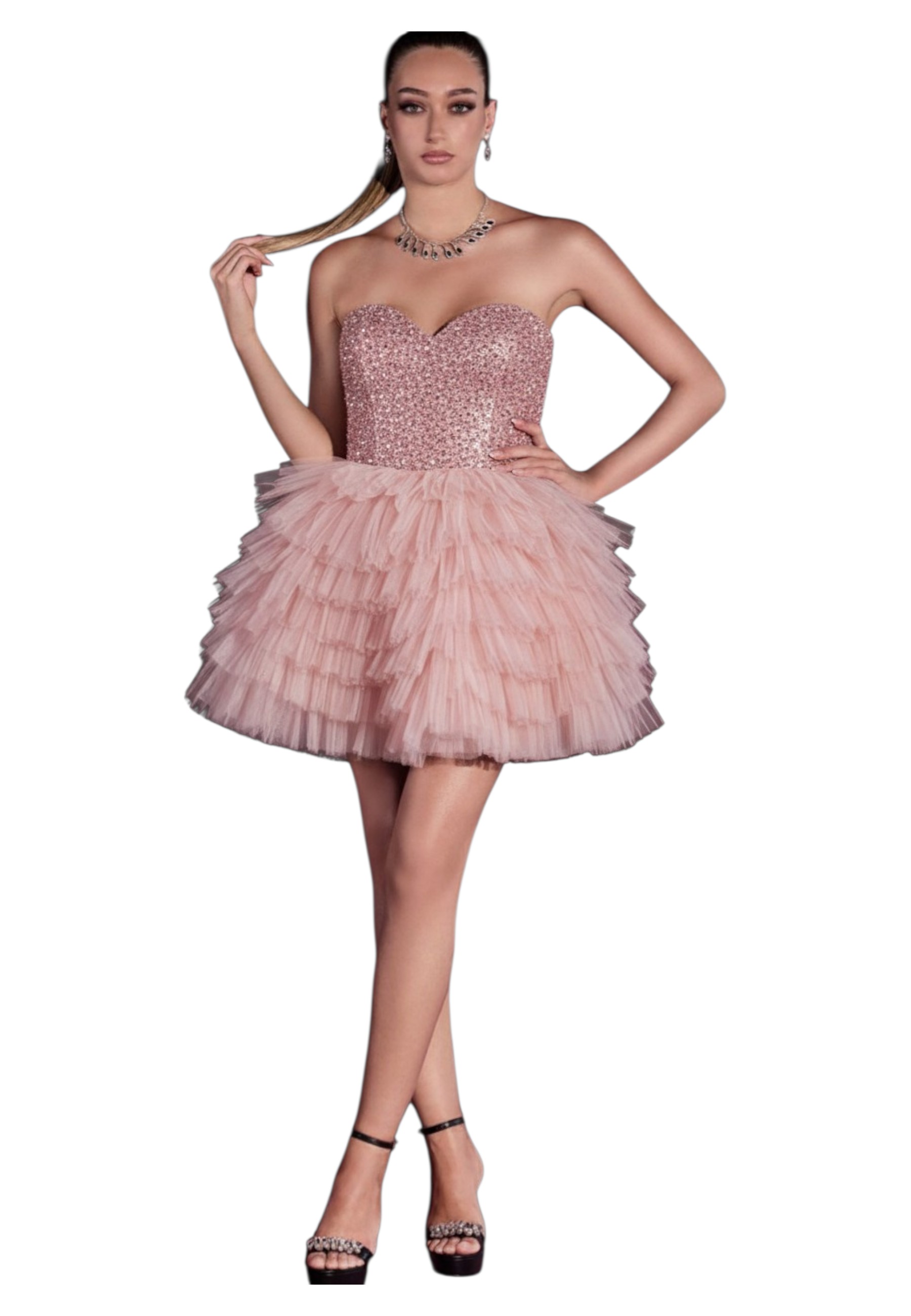 Femminile e raffinato, questo abito corto con scollo a cuore valorizza il décolleté con una linea dolce e armoniosa. Il corpetto è impreziosito da eleganti applicazioni che donano luce e un tocco di ricercatezza al look.