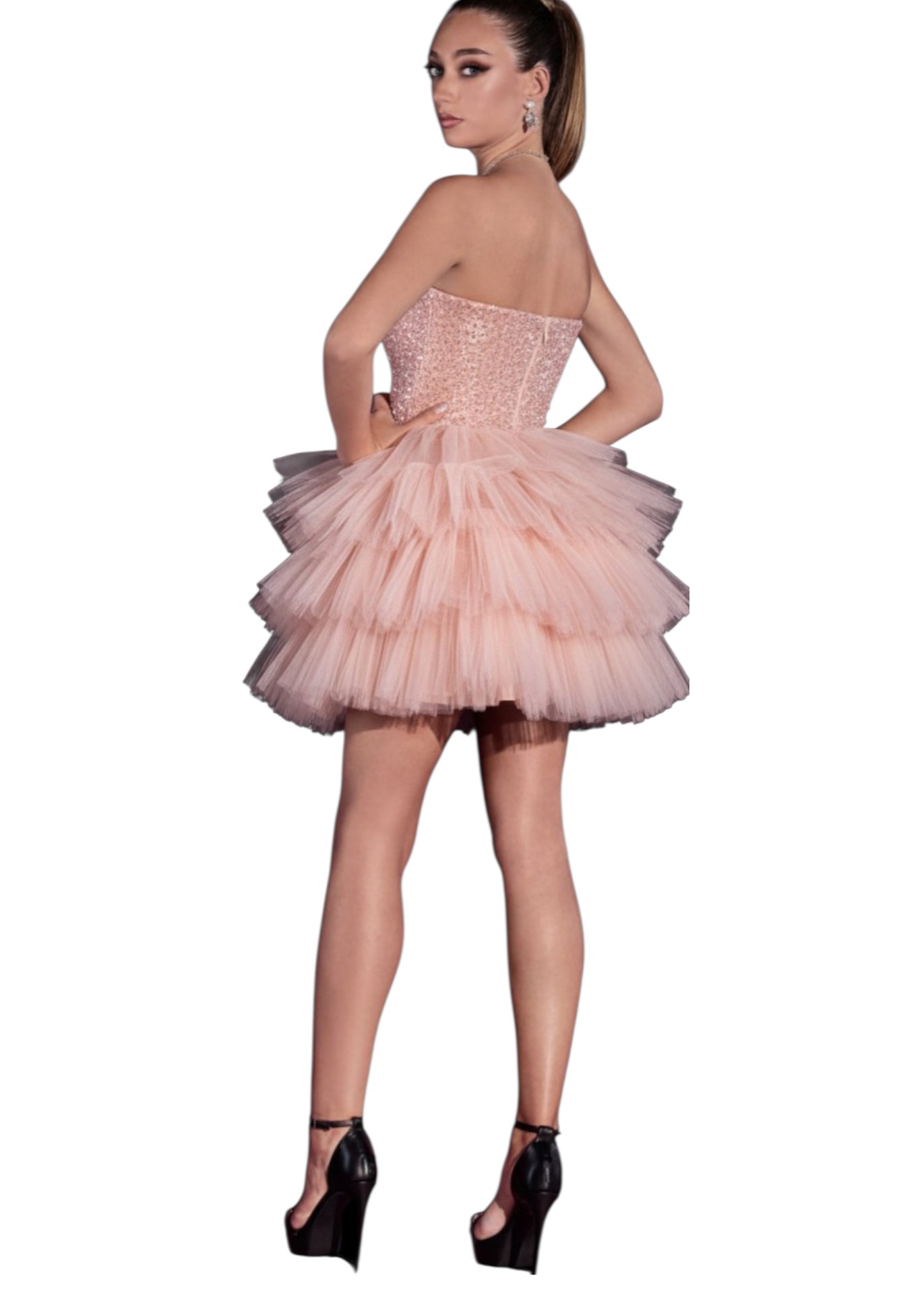 La gonna a balze aggiunge movimento e leggerezza, creando un effetto dinamico e romantico ad ogni passo. La silhouette è studiata per esaltare la figura con stile e grazia.