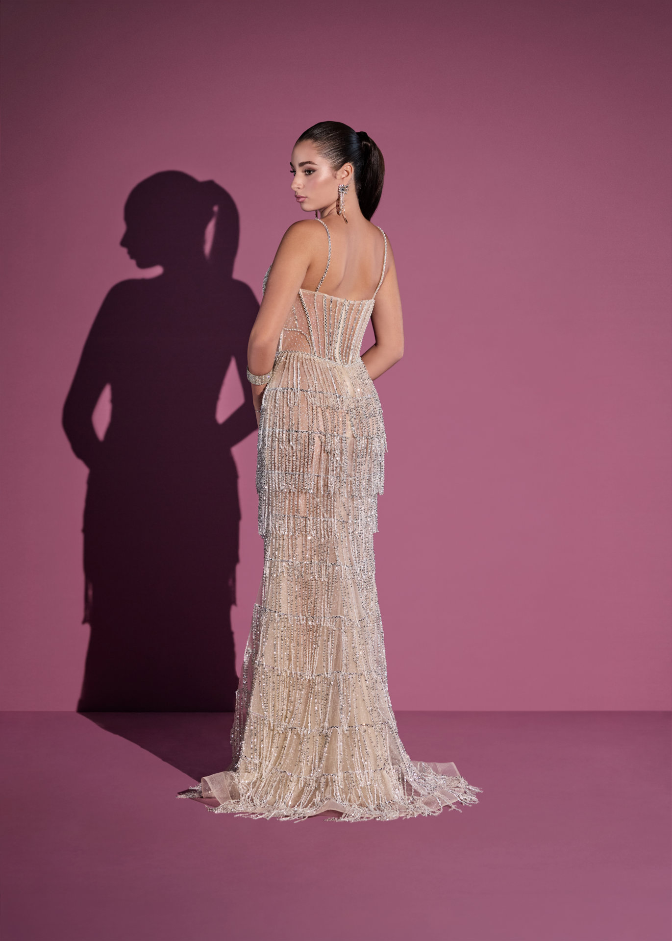 Abito lungo dal fascino luminoso e sofisticato, impreziosito da frange gioiello in paillettes e delicati corallini che creano un movimento scintillante ad ogni passo. Le sottili bretelle valorizzano con grazia le spalle, mentre il corpetto strutturato è arricchito da raffinate applicazioni decorative che esaltano la silhouette con un tocco couture.