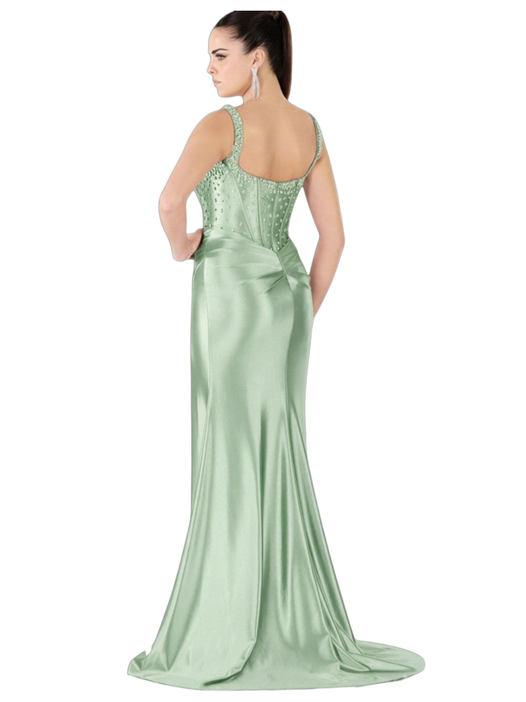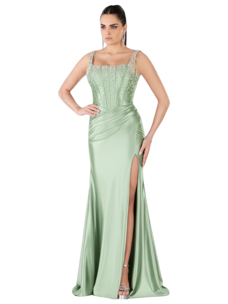 Elegante abito lungo da donna, perfetto per cerimonie ed eventi speciali. Il modello presenta un raffinato corpetto impreziosito da applicazioni di pietre luminose che donano brillantezza e valorizzano il décolleté.