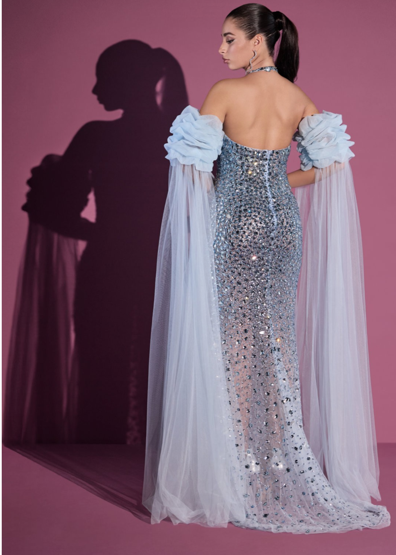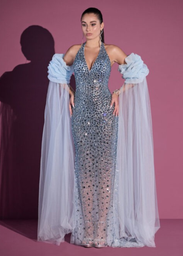 Abito lungo gioiello in tessuto con delicate trasparenze, interamente ricoperto da preziose applicazioni di pietre che illuminano la figura con eleganza e raffinatezza.
