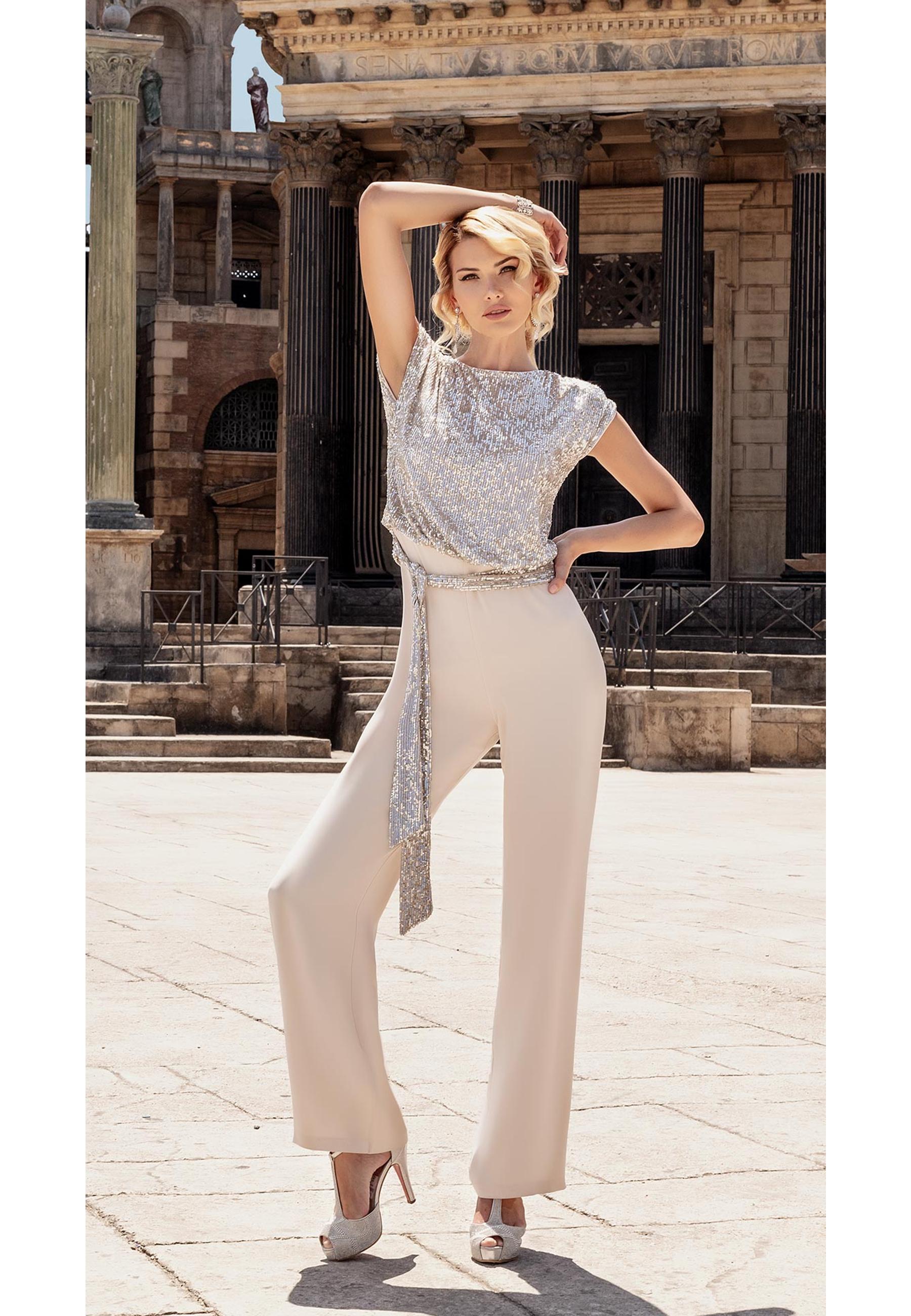 Tuta in crèpe con corpetto in tulle elasticizzato interamente rivestito di micro paillettes. Il corpetto ha scollo tondo che termina sul retro con la scollatura a V. La manica è scesa e la cintura ripresa in più punti crea degli oblò. Il pantalone in crèpe ha linea dritta. La chiusura è sul retro con cerniera invisibile. Sarete glamour nelle vostre occasioni importanti.