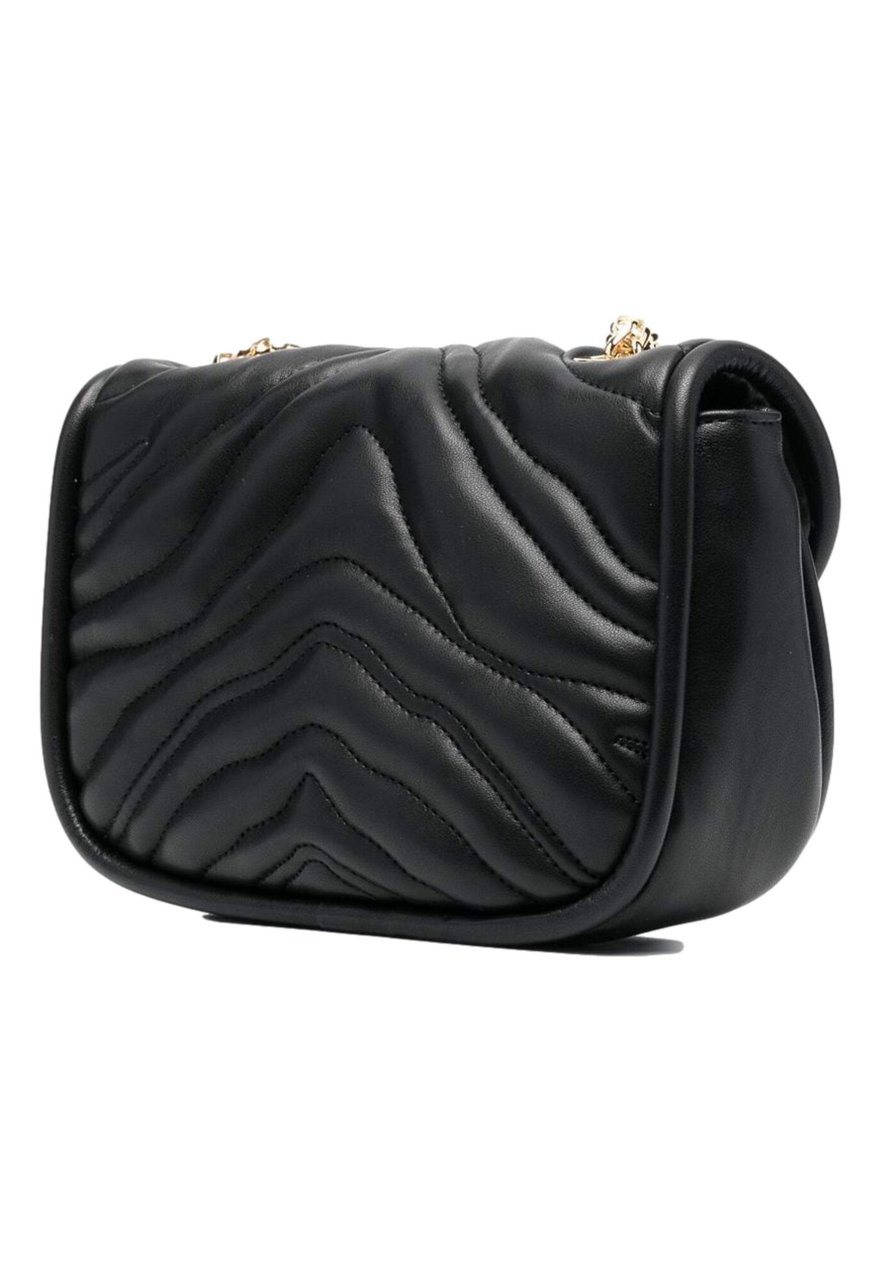 Nero intenso, placca con logo color oro, design trapuntato, pattina nella parte superiore, tracolla a catena scorrevole e tasca interna con zip.