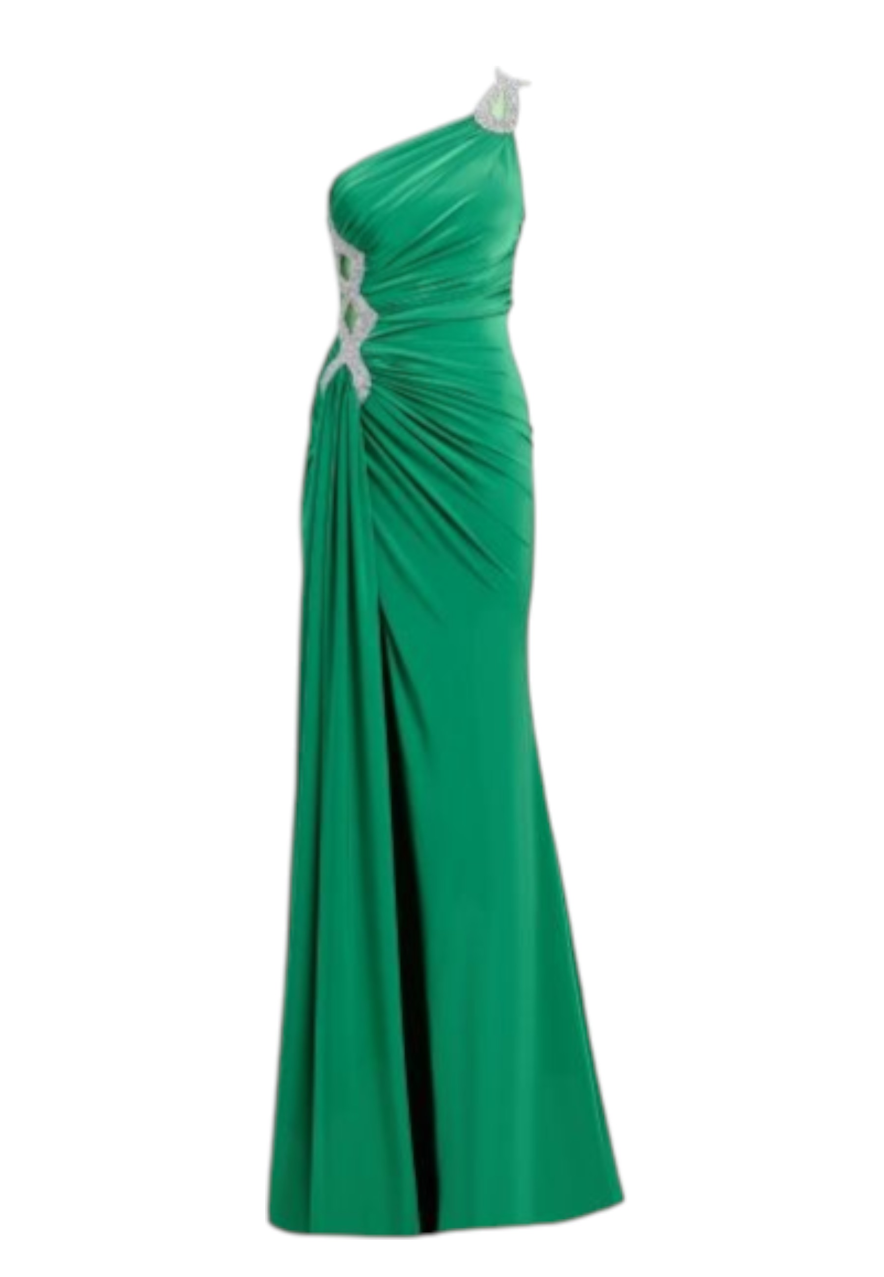 Elegante abito lungo in tessuto elastico, dal colore verde intenso, pensato per valorizzare la silhouette con stile e femminilità. Il design monospalla dona un tocco moderno e raffinato, mettendo in risalto la linea delle spalle.