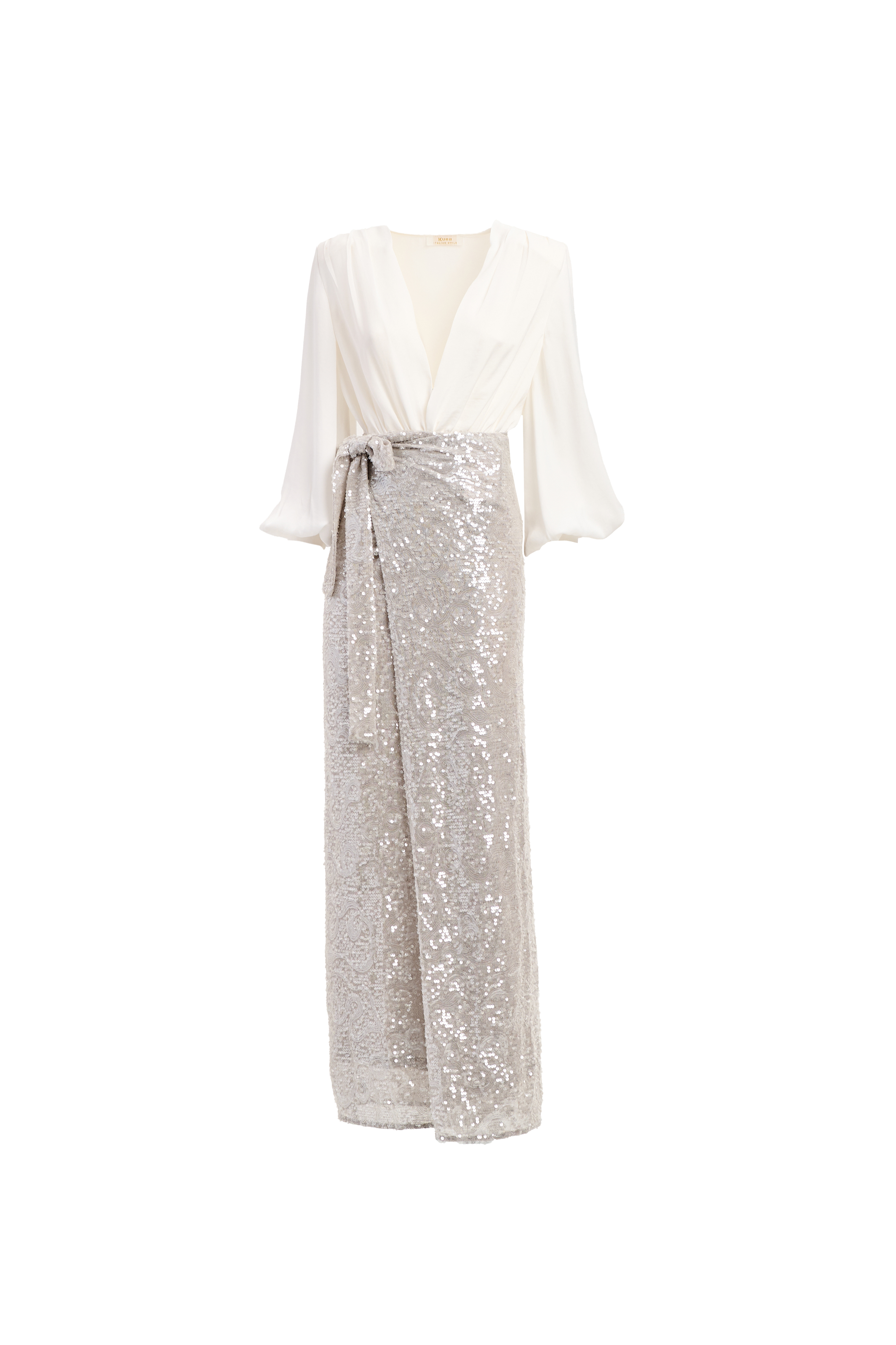 La gonna è interamente ricoperta di paillettes, per un effetto luminoso e glamour. Il modello è caratterizzato da un allaccio a portafoglio, che avvolge la silhouette e crea una linea femminile ed elegante.