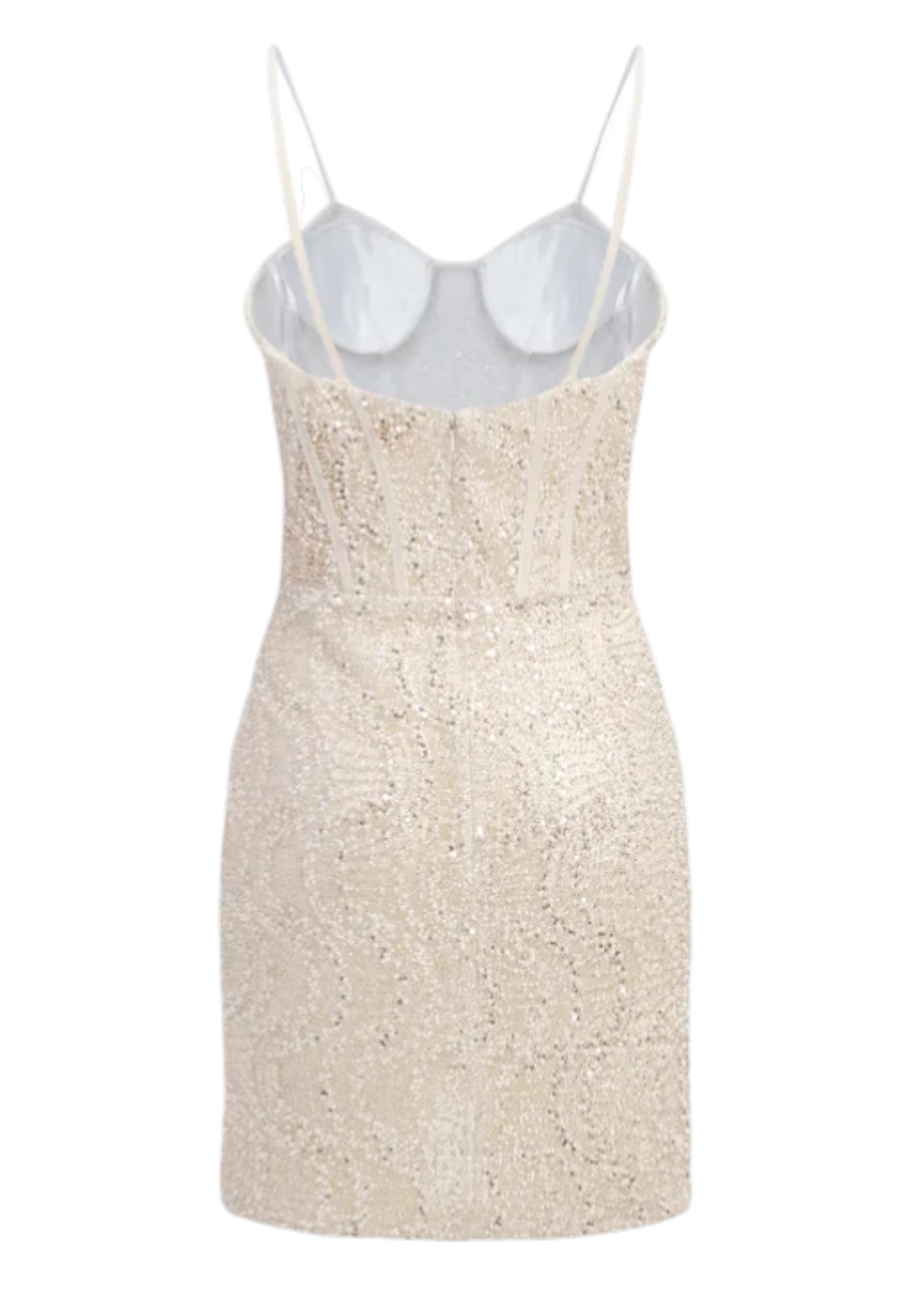 Abito corto interamente impreziosito da applicazioni, caratterizzato da raffinati dettagli su tutta la superficie che aggiungono texture e lucentezza al capo.
