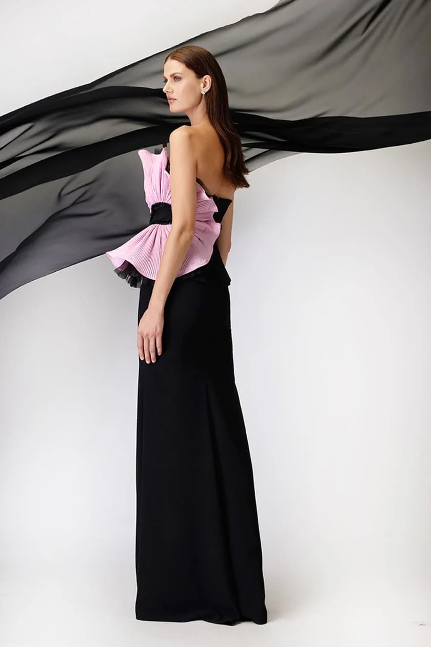 Un look sofisticato e d'impatto, perfetto per chi ama i dettagli che fanno la differenza. Il corpetto, impreziosito da eleganti rouches rosa a contrasto, dona volume e movimento alla parte superiore, creando un effetto romantico e moderno al tempo stesso. La gonna, semplice e fluida, bilancia l'ensemble con grazia e raffinatezza. Ideale per cerimonie, serate eleganti o occasioni speciali in cui brillare con stile.