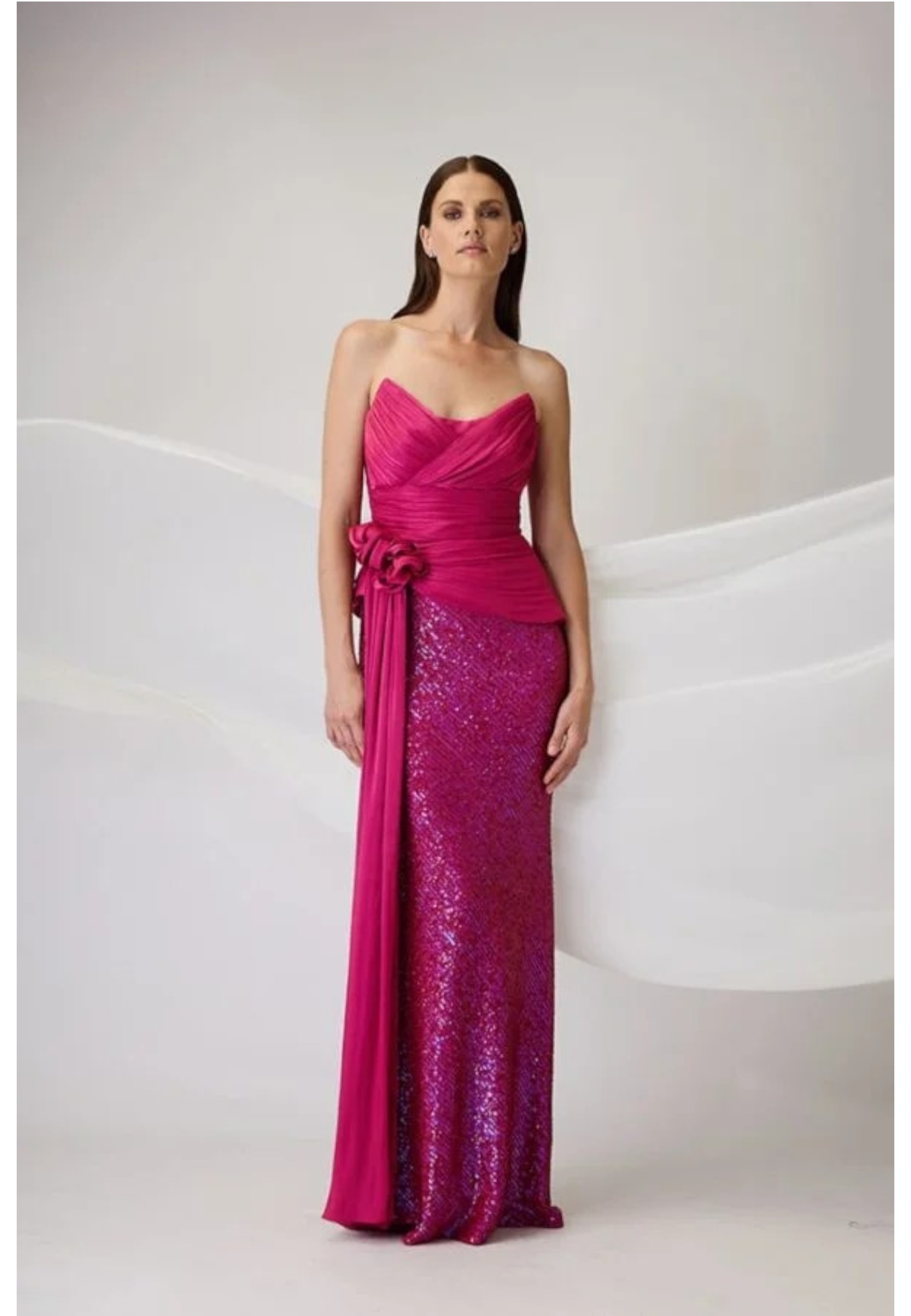 Un equilibrio perfetto tra eleganza e brillantezza. Questo coordinato è composto da un corpetto essenziale e raffinato, abbinato a una gonna protagonista, interamente decorata con paillettes che catturano la luce a ogni movimento. Il contrasto tra la semplicità del top e il luccichio della gonna crea un look moderno, glamour e di grande impatto. Ideale per cerimonie, party o serate speciali, l' abito è comprensivo di stola in coordinato.