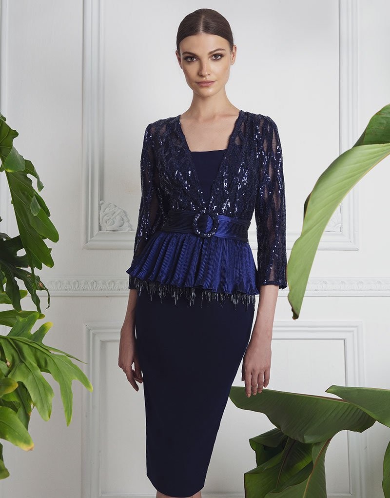 Elegante completo composto da un abito tubino in raffinato blu notte e giacca coordinata. La giacca è impreziosita da una lavorazione di micro paillettes e applicazioni tono su tono che creano raffinati giochi di luce. Un dettaglio distintivo è la balza sul fondo, realizzata in tessuto rasato plisse, che dona un tocco di eleganza e movimento al capo. La cintura in vita definisce armoniosamente la silhouette. Il tubino, dalla linea pulita e aderente, completa l'insieme con sobrietà e stile.