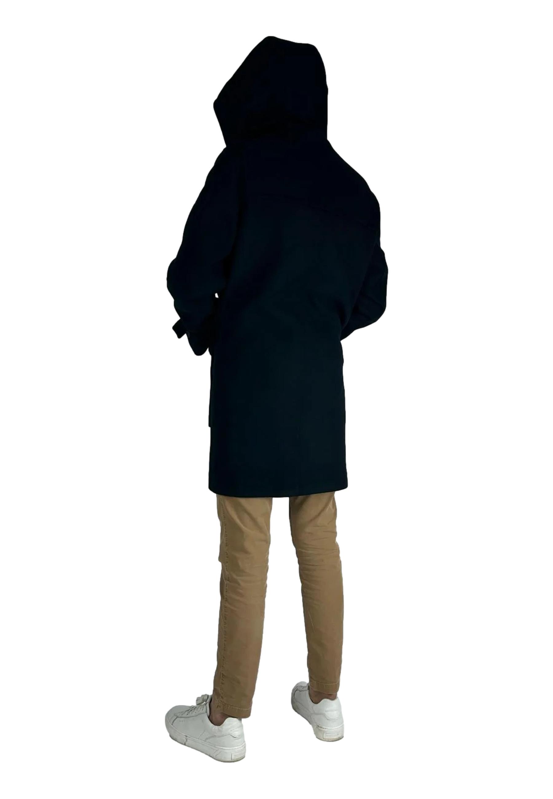 Montgomery foderato, chiusura con alamari, due tasche a toppa frontali, finiture con impunture. Panno velour misto lana