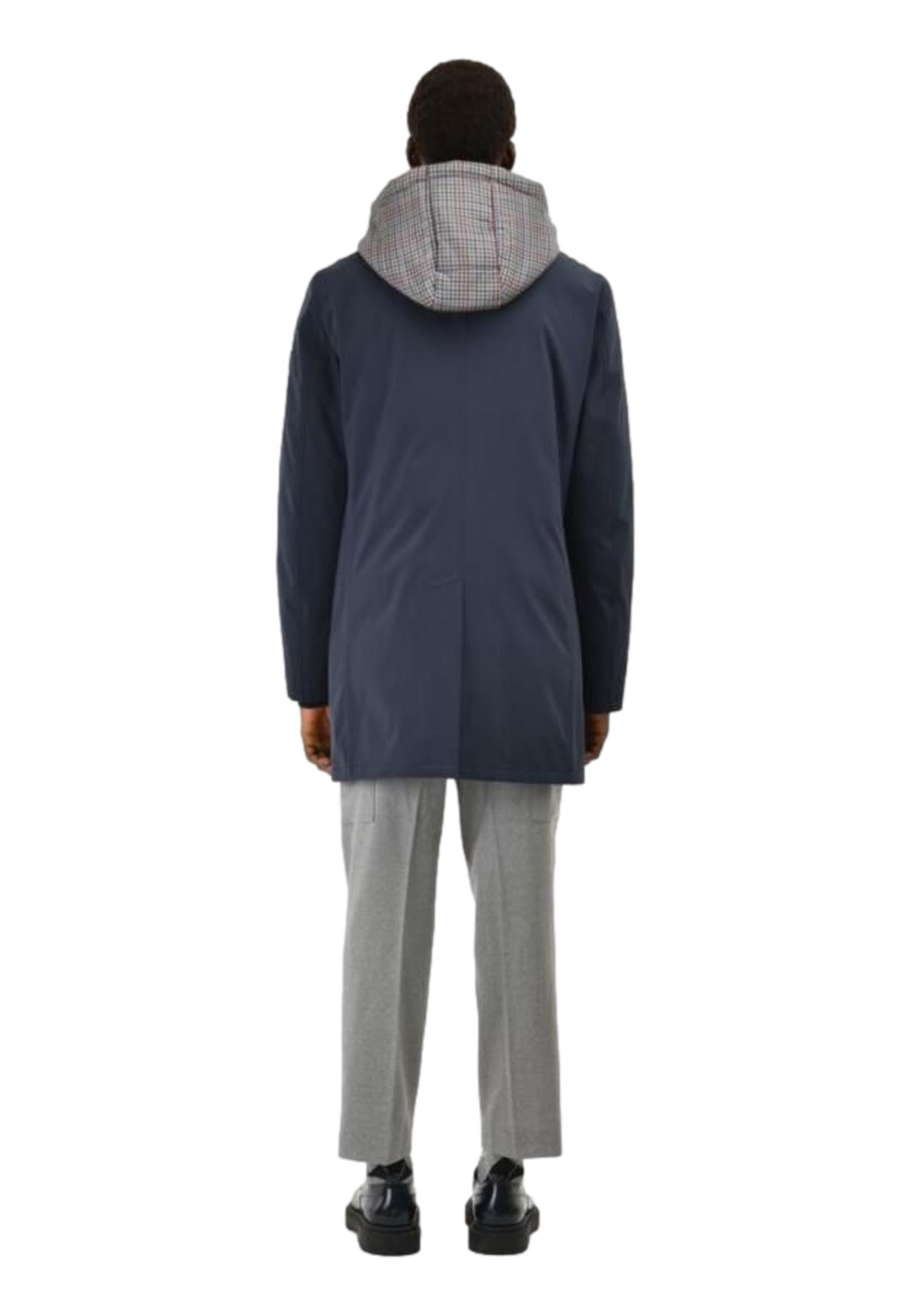 Trench imbottito con cappuccio. Chiusura zip e automatici a scomparsa, due tasche laterali con bottoncino automatico, uno spacco centrale sul retro, cappuccio con zip staccabile. Soft shell accoppiato in poliestere stretch