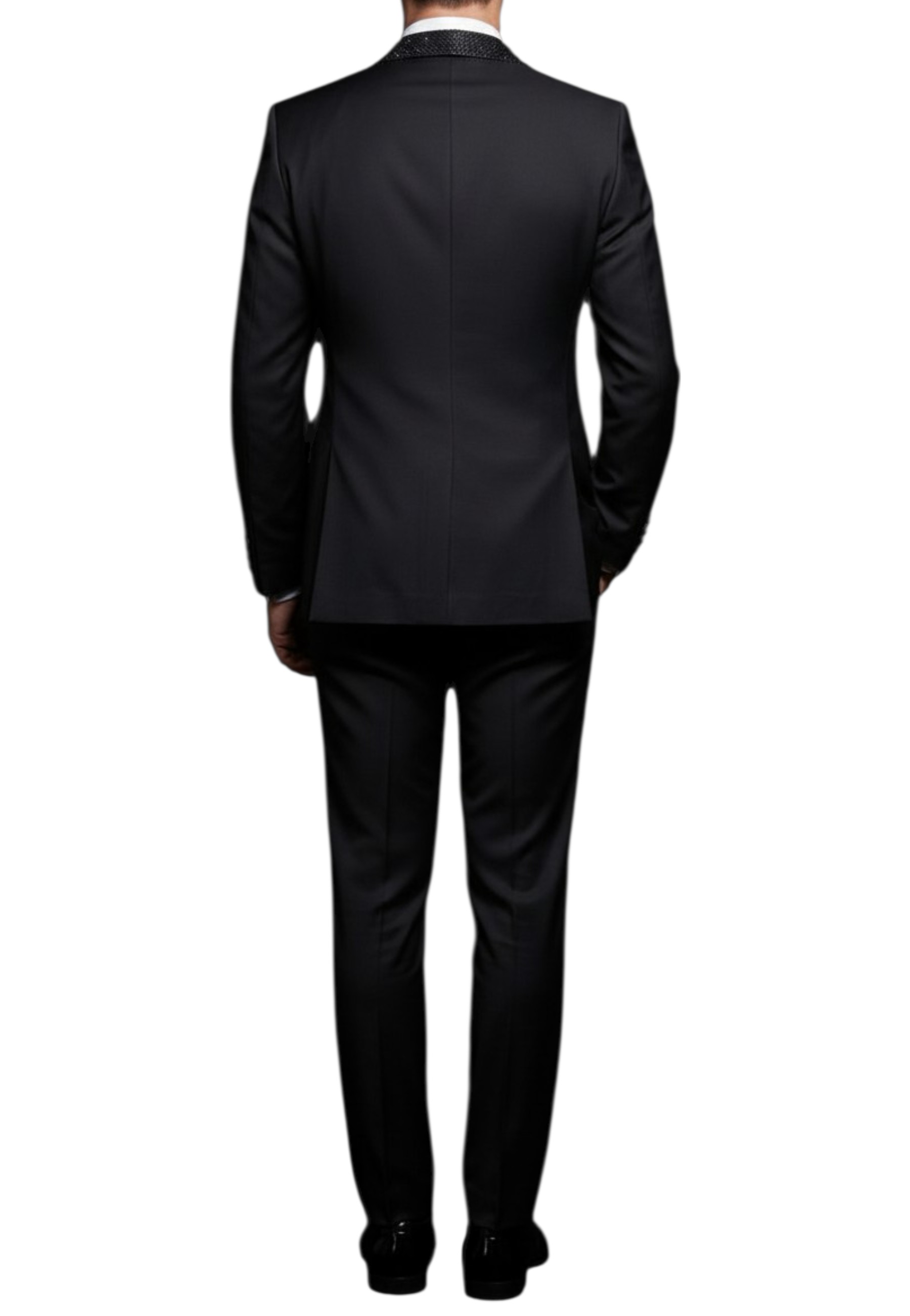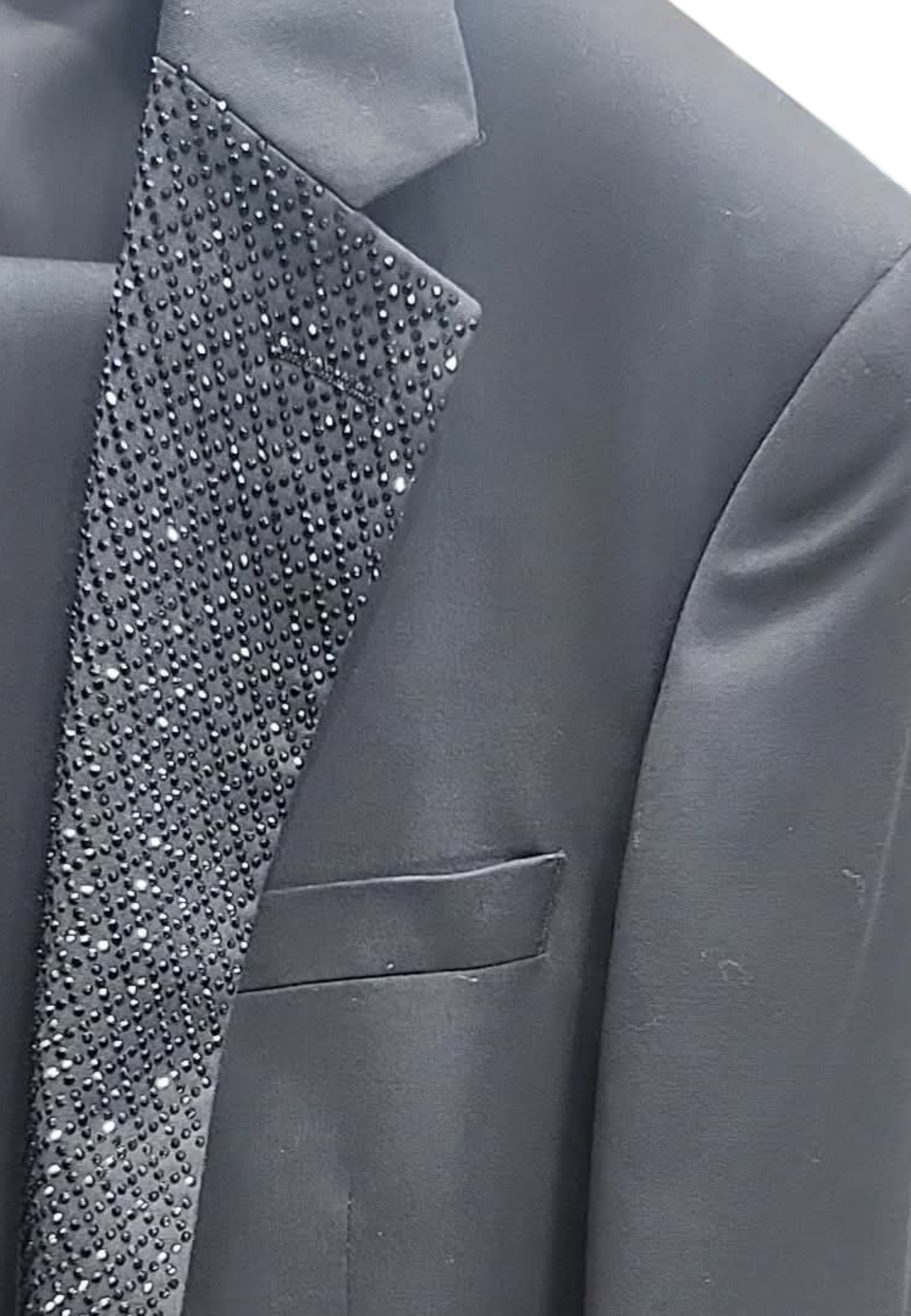Smoking di grande impatto, caratterizzato da un raffinato petto a lancia impreziosito da rever strassato che cattura la luce con discreta eleganza. La giacca a due bottoni, completata da tasche a pattina, mantiene un equilibrio perfetto tra classicità e dettagli contemporanei. Ideale per eventi esclusivi e serate di gala, è pensato per chi desidera distinguersi con uno stile deciso e sofisticato.