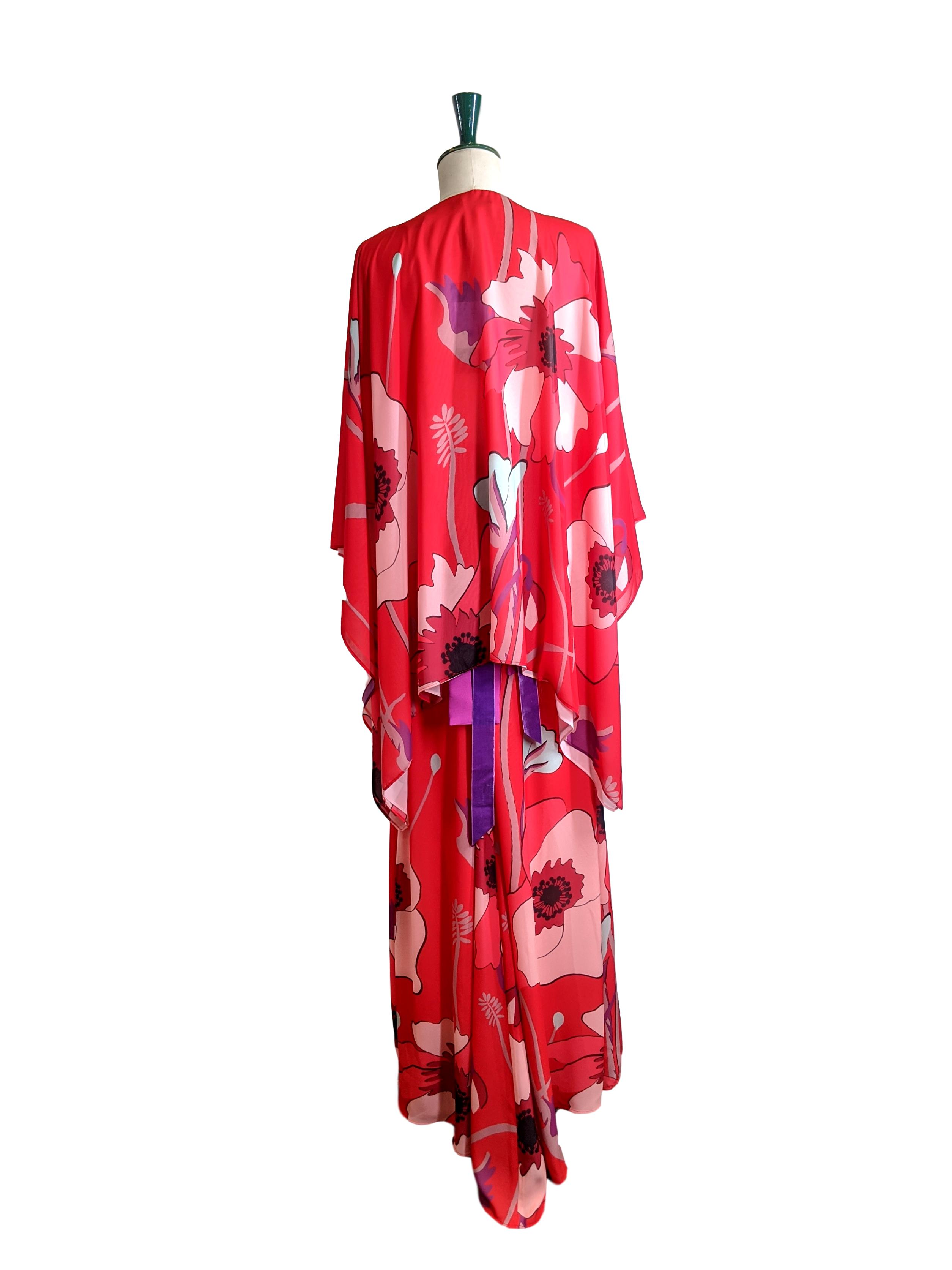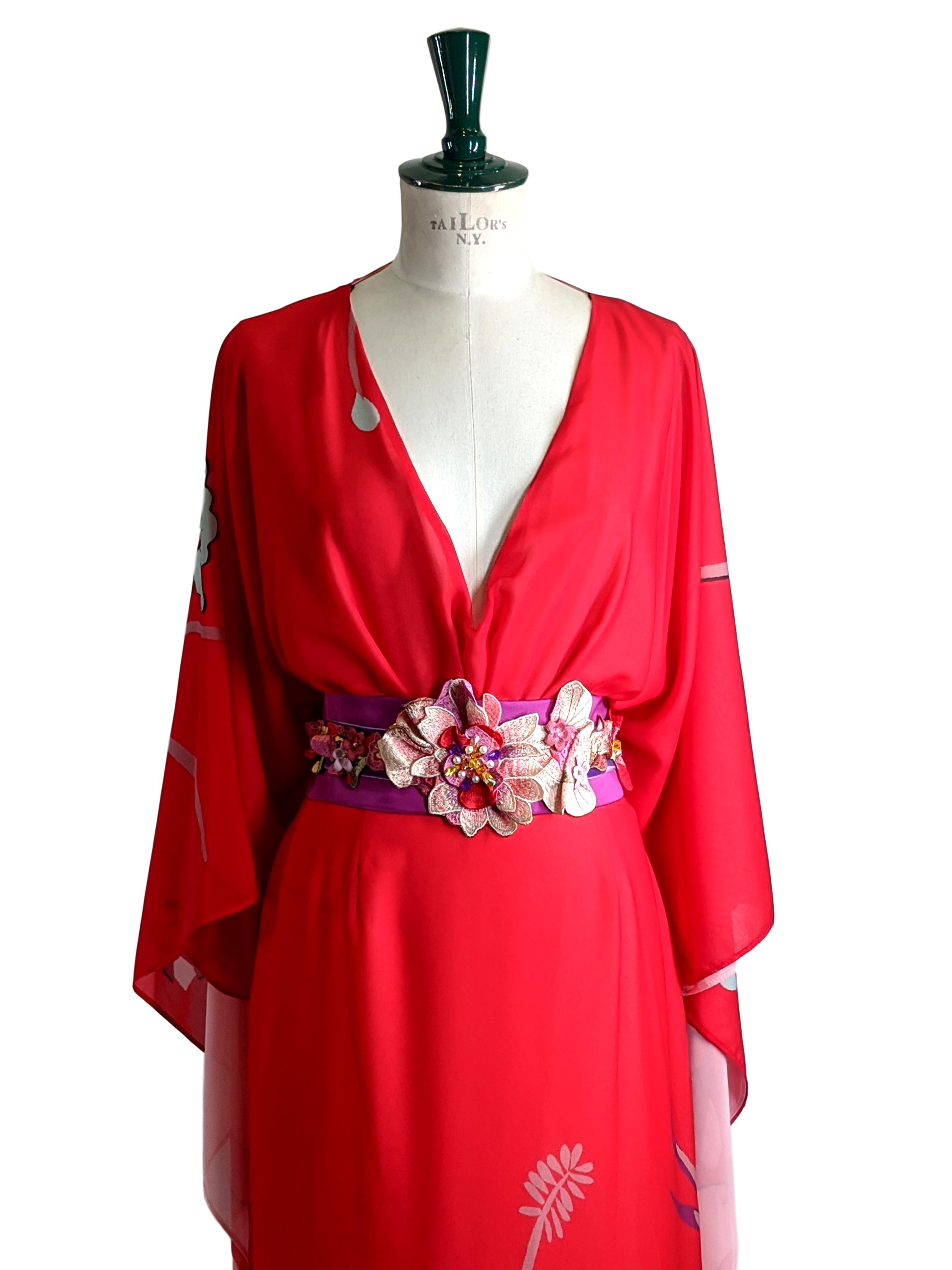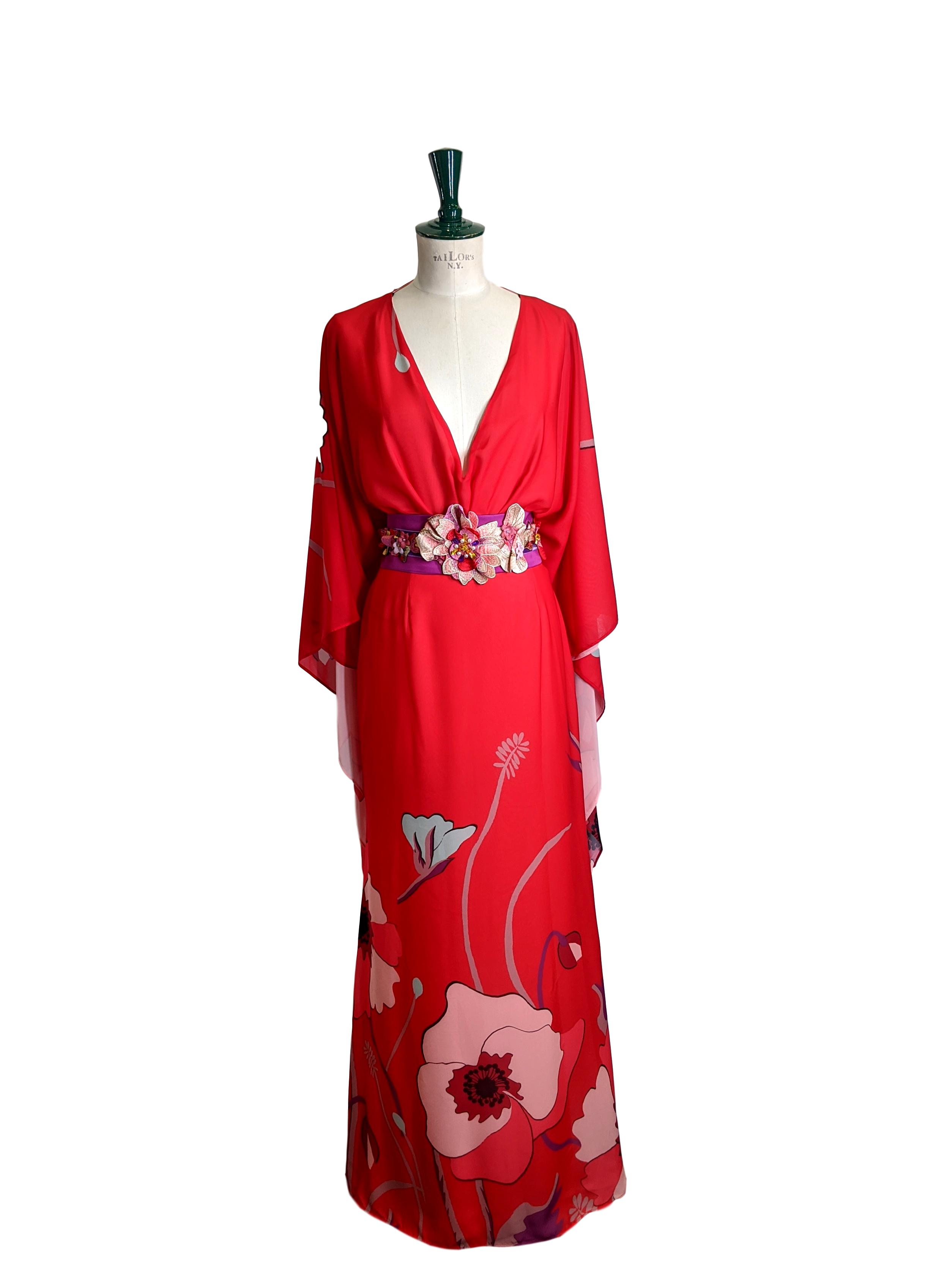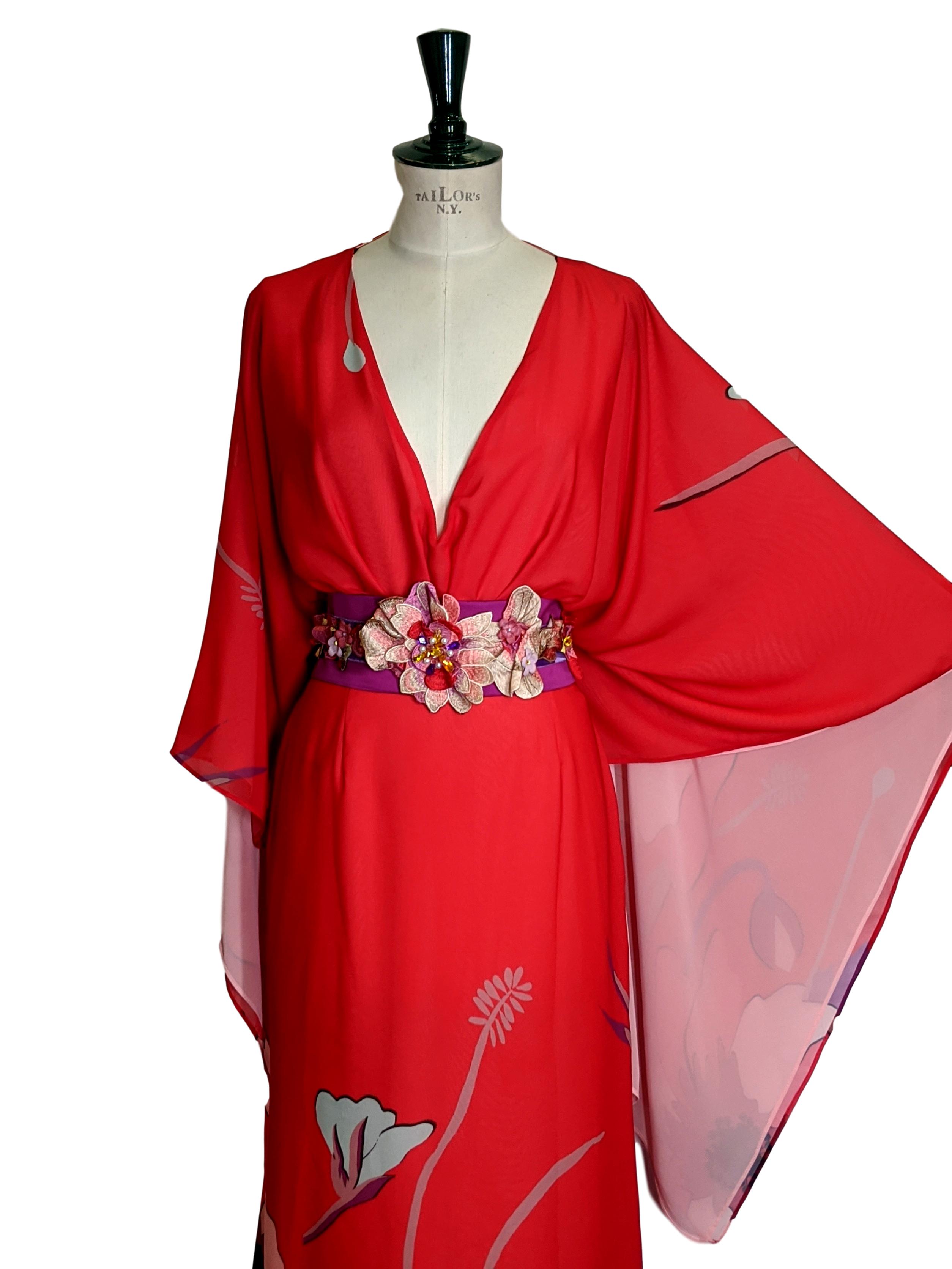 ABITO LUNGO STILE KIMONO CON FANTASIA FLOREALE E CINTURA A CONTRASTO REMOVIBILE.