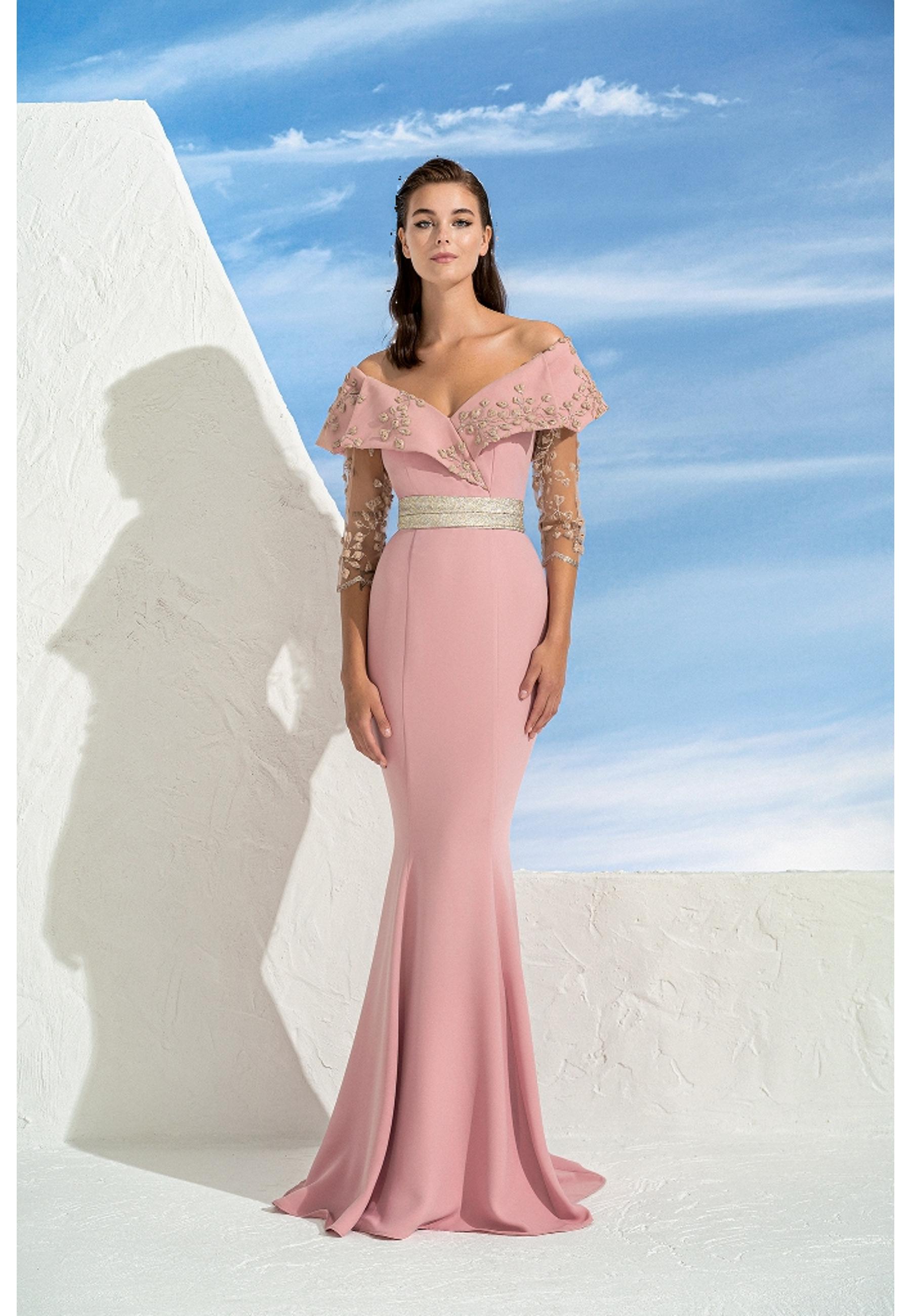 Abito lungo modello sirena scollo bardot e maniche con lavorazione MISCHALIS | Abiti | M1 854711