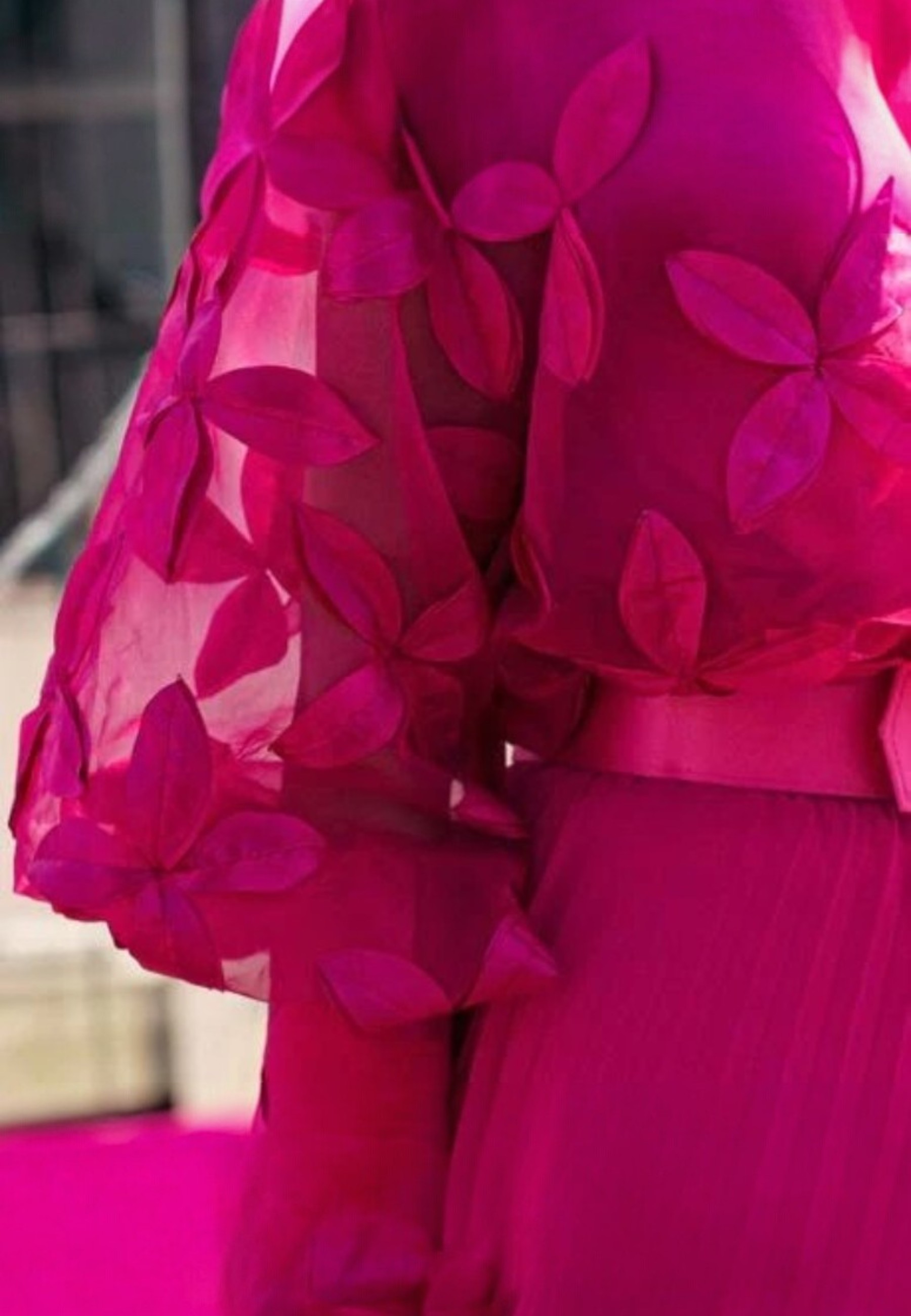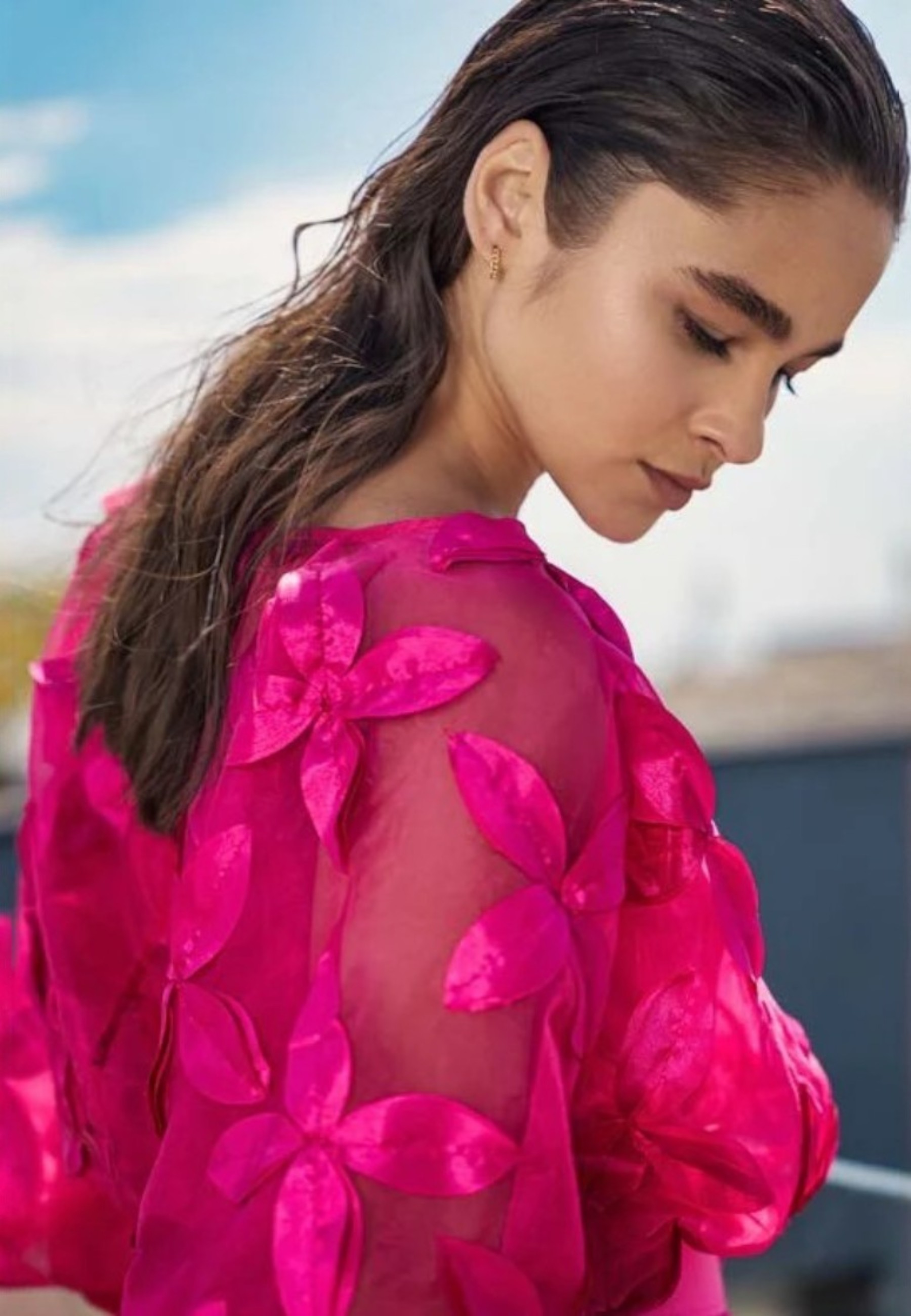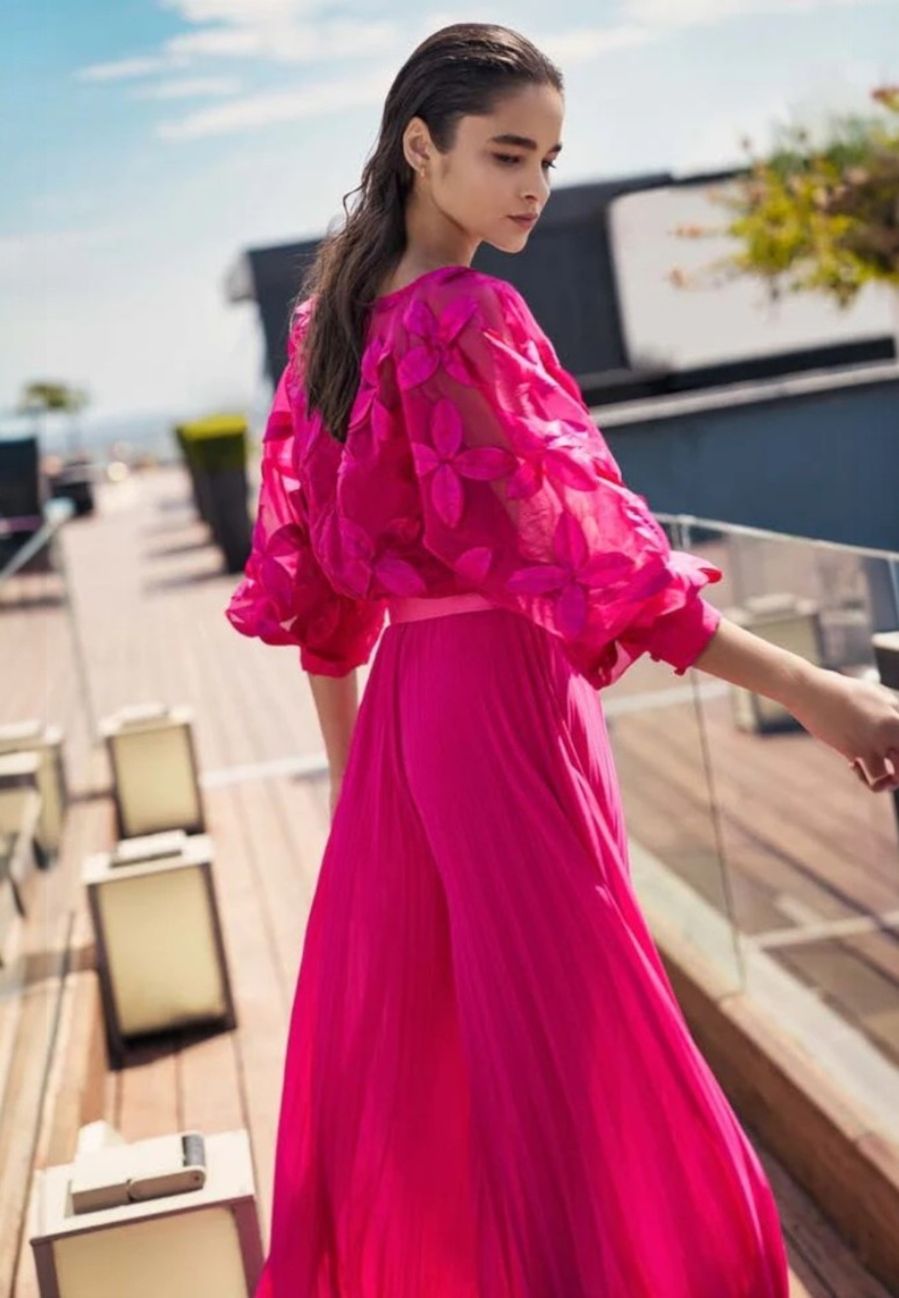Coordinato formato da un elegante pantalone plissettato, abbinato a un top e una blusa in organza, impreziositi da delicate applicazioni floreali. Un look sofisticato e raffinato, perfetto per ogni occasione speciale.