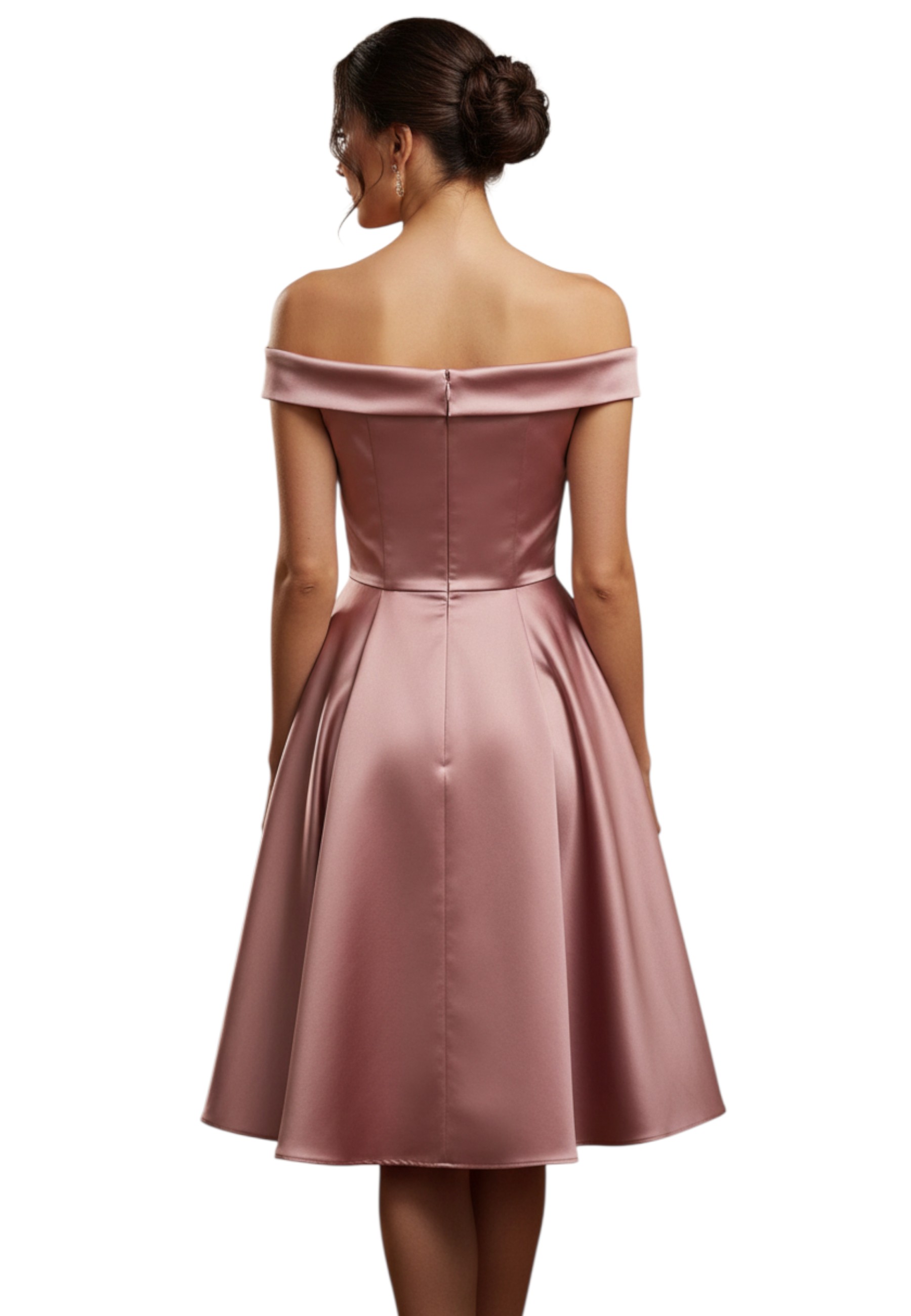 Abito tinta unita in tessuto rasato con scollo a barca e gonna morbida con spacco.