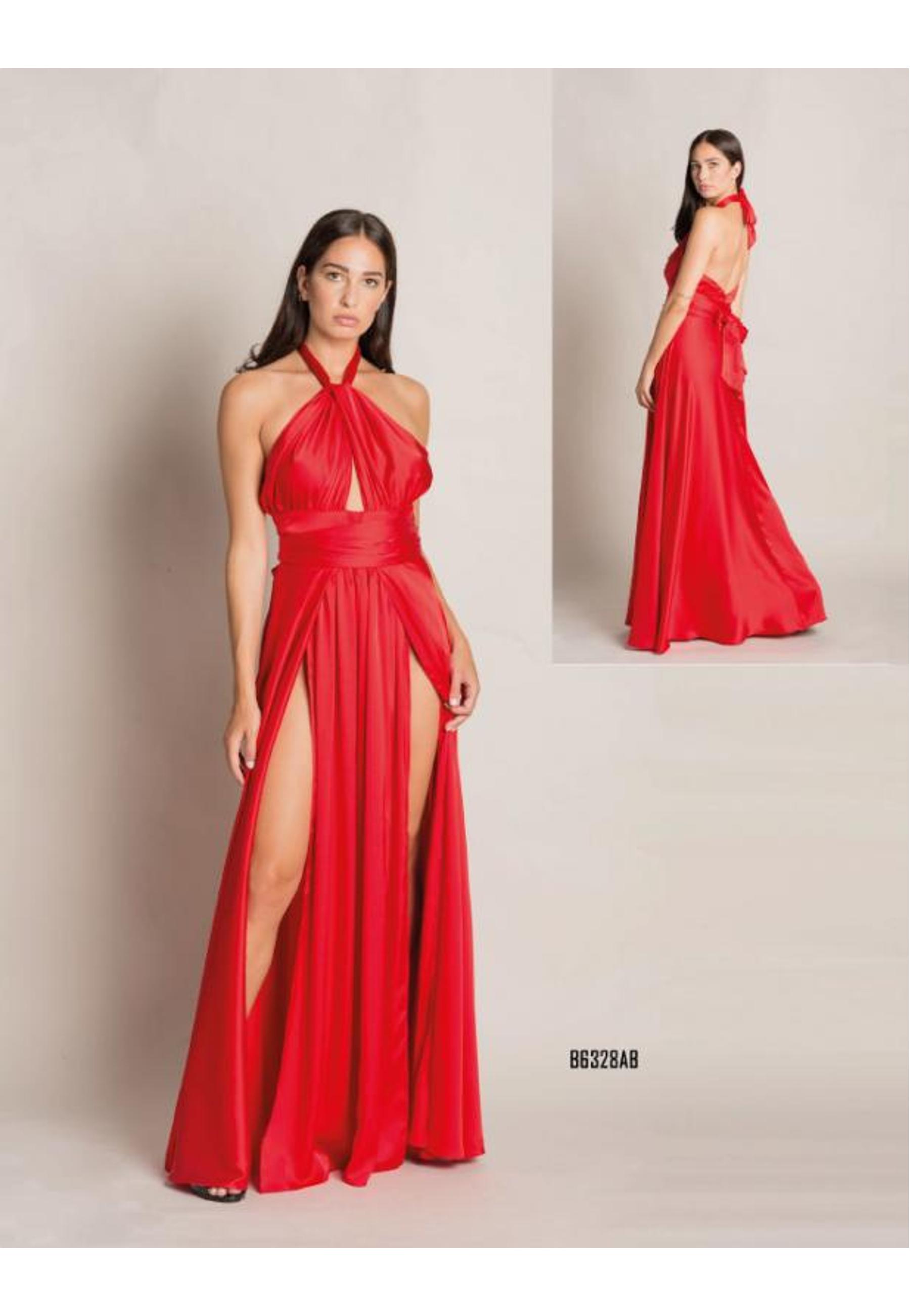ABITO DI LUSSO MADE IN ITALY CON SCOLLO ALL'AMERICANA IN ROSSO. DUE SPACCHI AVANTI E CINTURA CHE DEFINISCE PUNTO VITA. COMPRENSIVO DI STOLA.