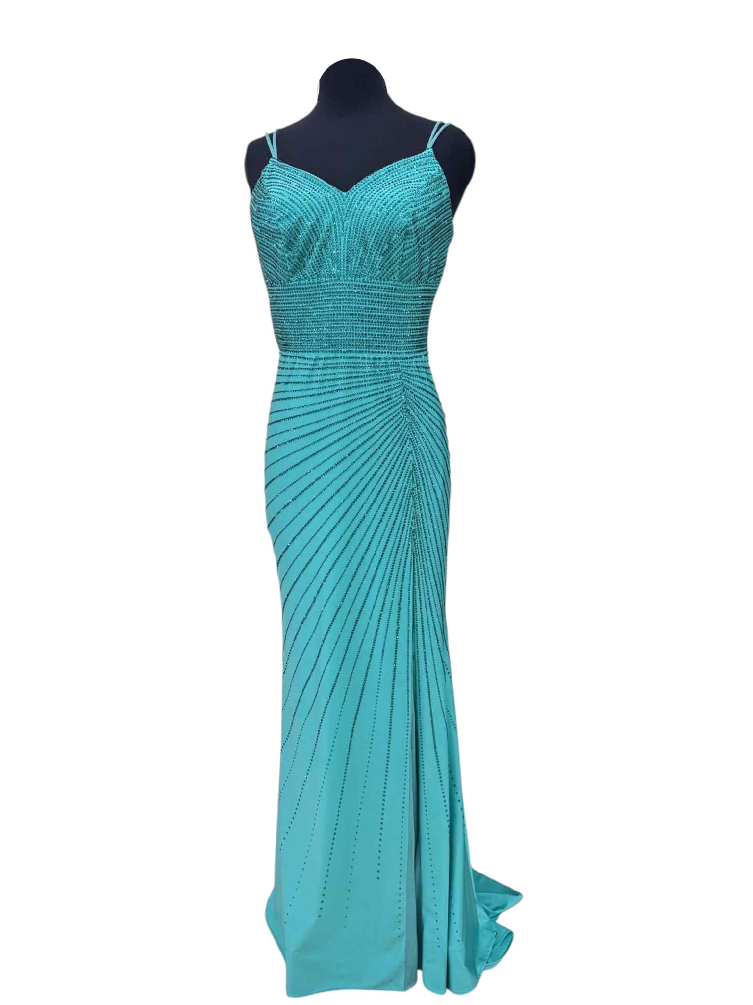 Abito lungo in tessuto stretch che valorizza la silhouette con eleganza e femminilità. Il design è impreziosito da un raffinato motivo di strass sul davanti e sul retro, che dona luce e carattere al capo. Lo scollo a V mette in risalto il décolleté, mentre la doppia bretella sottile aggiunge un tocco delicato e moderno. Lo spacco frontale completa il look con una nota sensuale e sofisticata, perfetto per occasioni speciali o serate glamour.