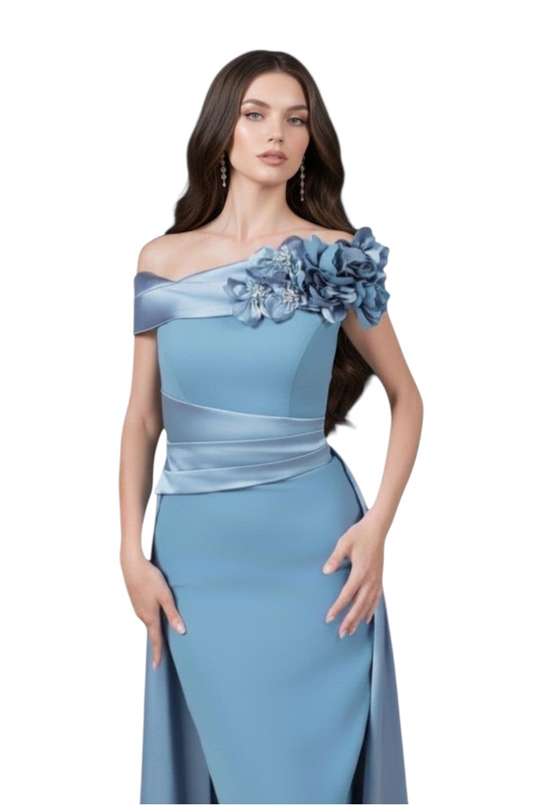 Lo scollo a barca esalta con delicatezza la linea delle spalle, mentre le applicazioni di fiori in tessuto a rilievo impreziosiscono l’abito con un dettaglio romantico e sofisticato, creando un effetto tridimensionale di grande eleganza.