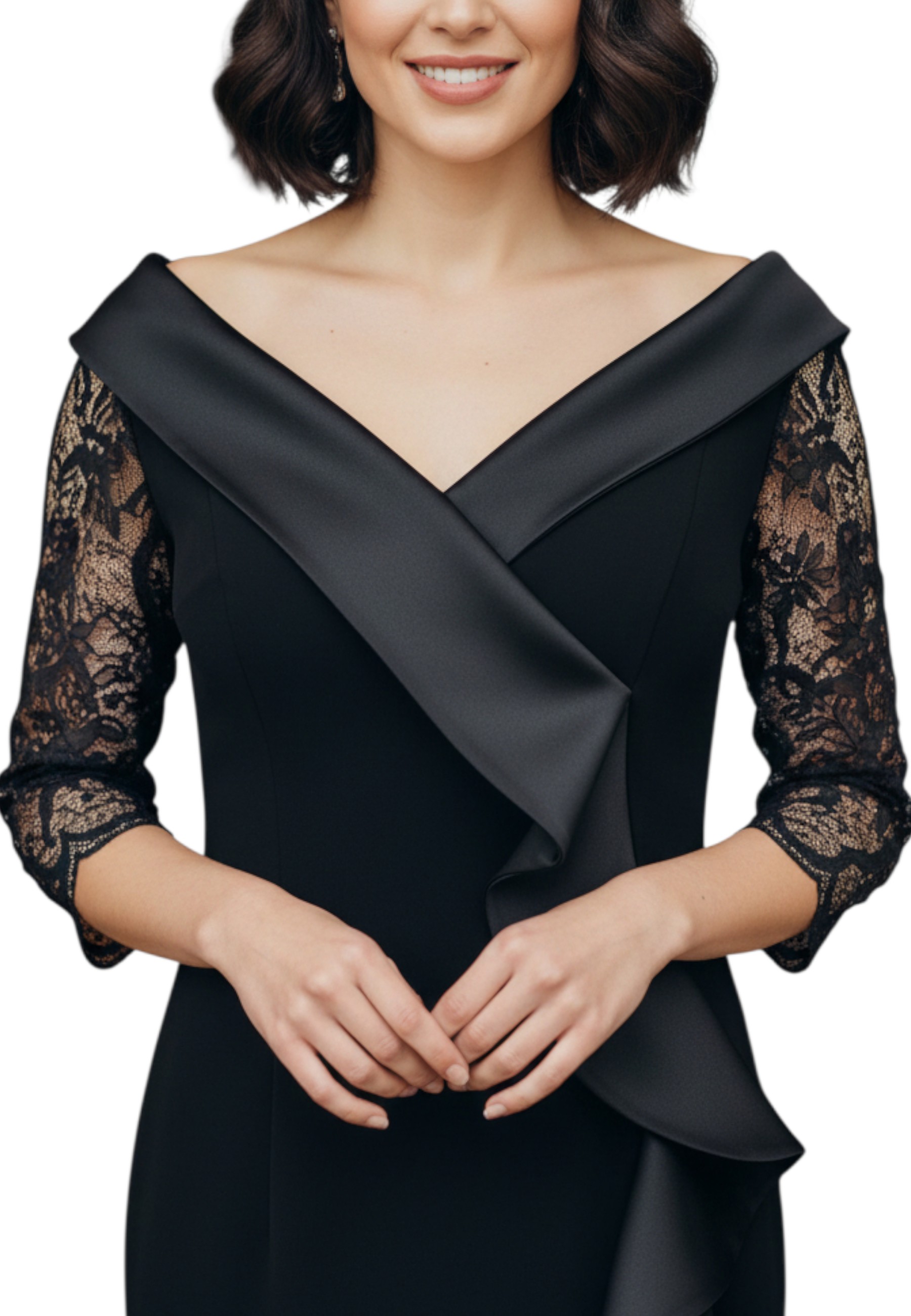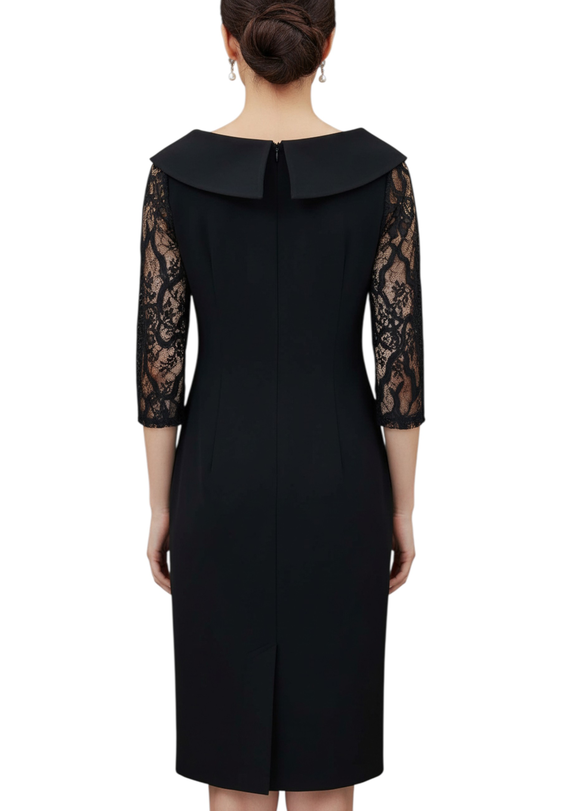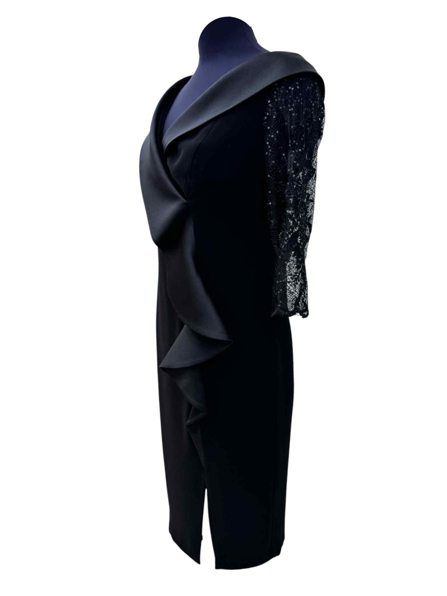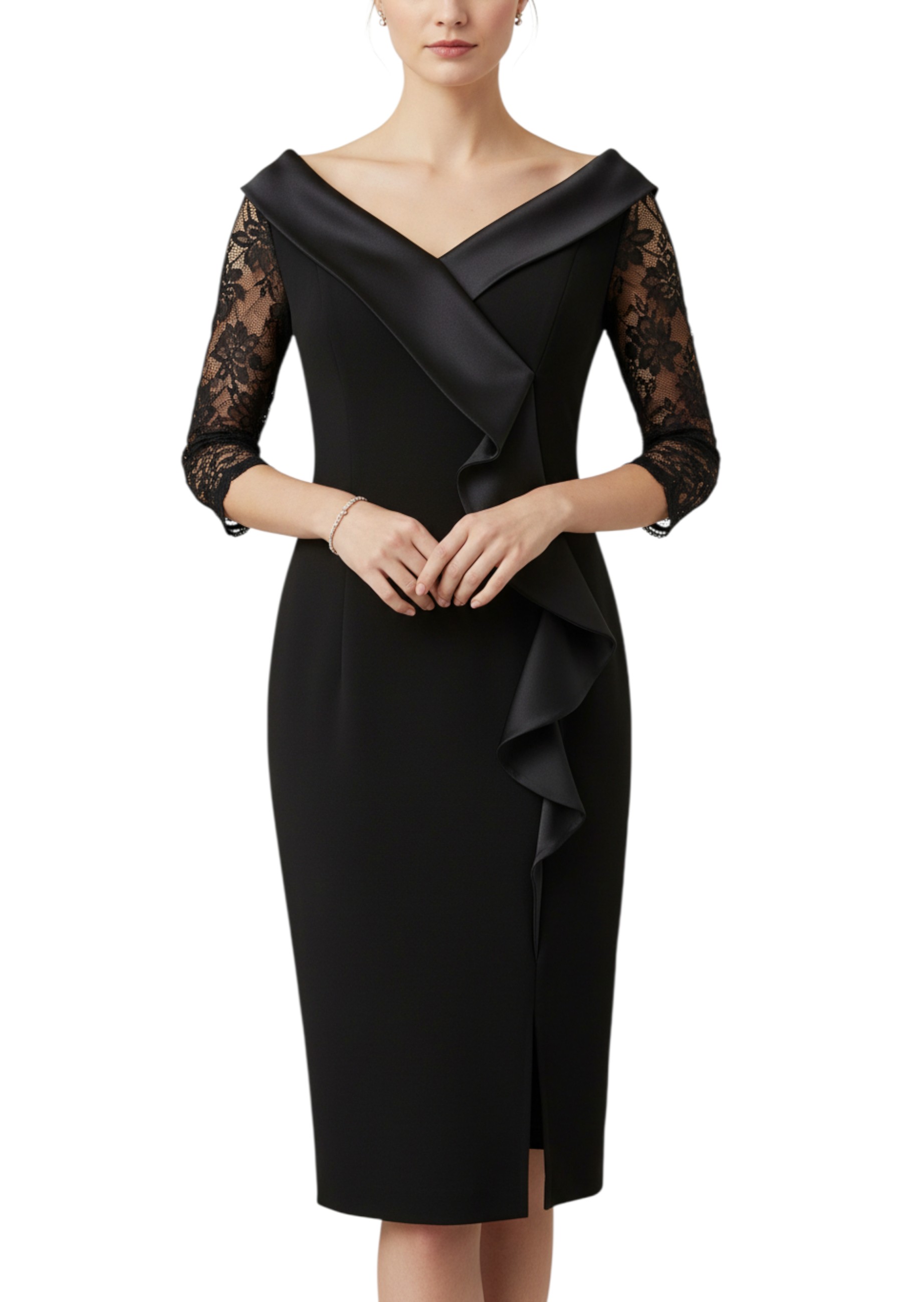 Questo elegante tubino da donna è un capo sofisticato e femminile, perfetto per valorizzare la figura con stile. Lo scollo a barca, impreziosito da un rever rasato, disegna con delicatezza la linea delle spalle, mentre la manica in pizzo dona un tocco di leggerezza e movimento. Sul davanti, rouches decorative aggiungono volume e un accento romantico, accompagnate da un piccolo spacco anteriore che conferisce sensualità senza eccessi. Il taglio aderente e la linea pulita rendono questo abito ideale per cerimonie, eventi serali o occasioni speciali, da indossare con disinvoltura ed eleganza.