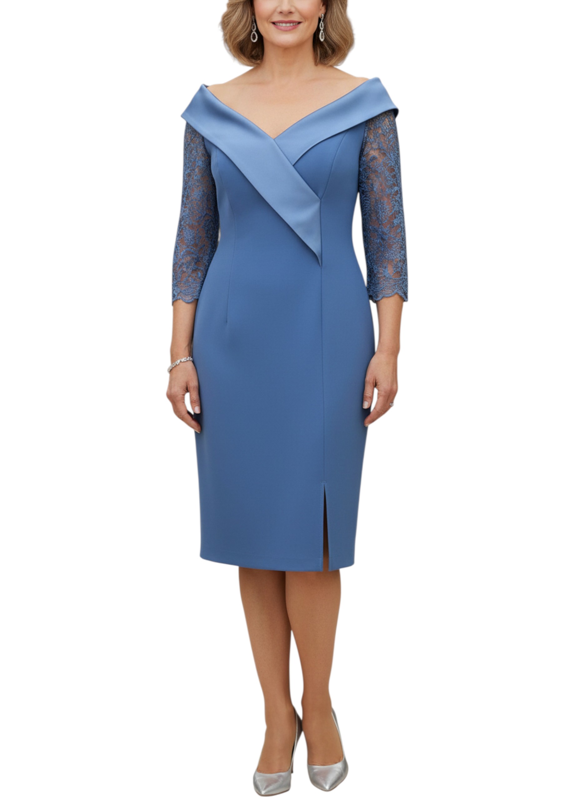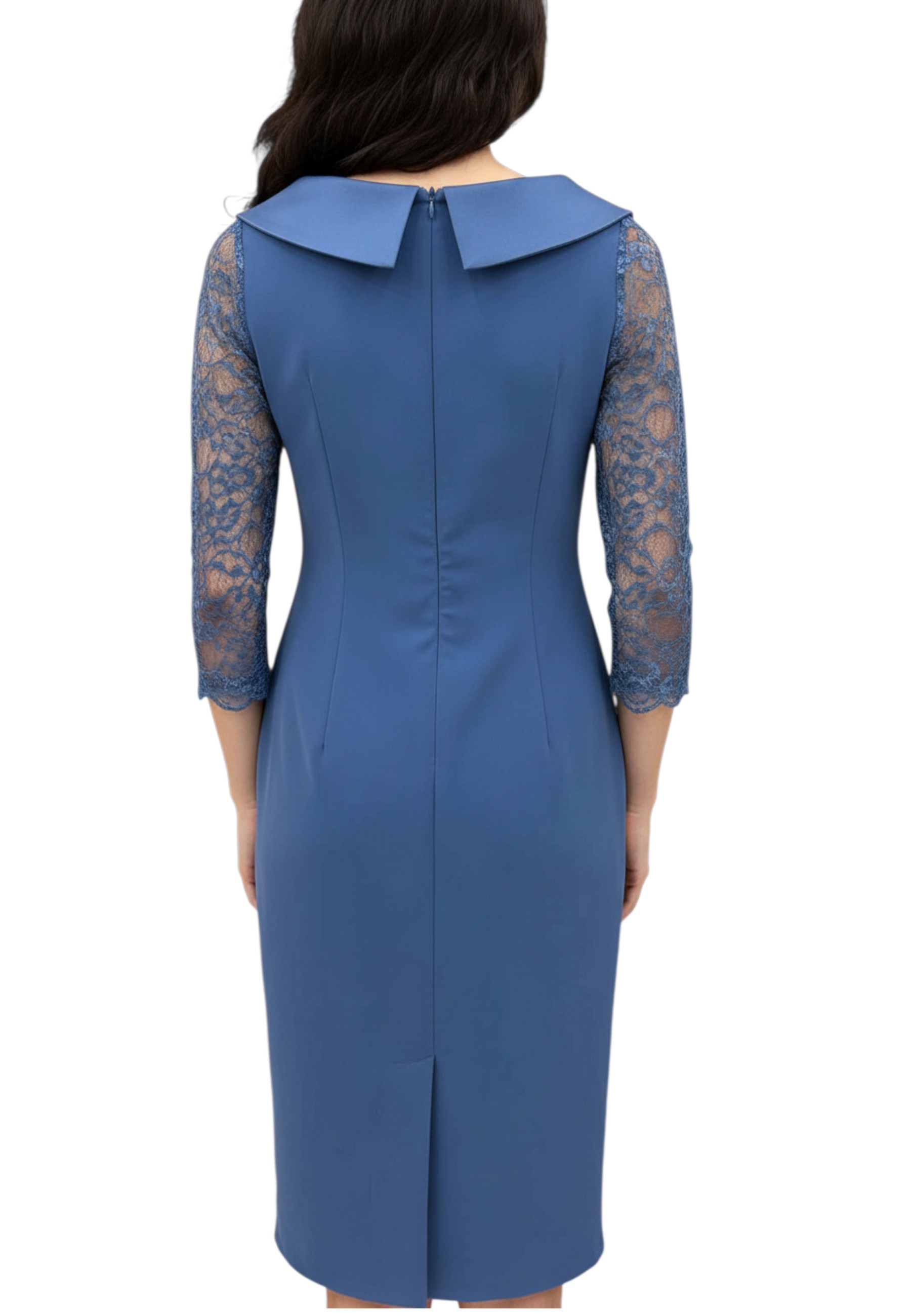 Questo elegante tubino da donna è un capo sofisticato e femminile, perfetto per valorizzare la figura con stile. Lo scollo a barca, impreziosito da un rever rasato, disegna con delicatezza la linea delle spalle, mentre la manica in pizzo dona un tocco di leggerezza e movimento. Sul davanti, rouches decorative aggiungono volume e un accento romantico, accompagnate da un piccolo spacco anteriore che conferisce sensualità senza eccessi. Il taglio aderente e la linea pulita rendono questo abito ideale per cerimonie, eventi serali o occasioni speciali, da indossare con disinvoltura ed eleganza.