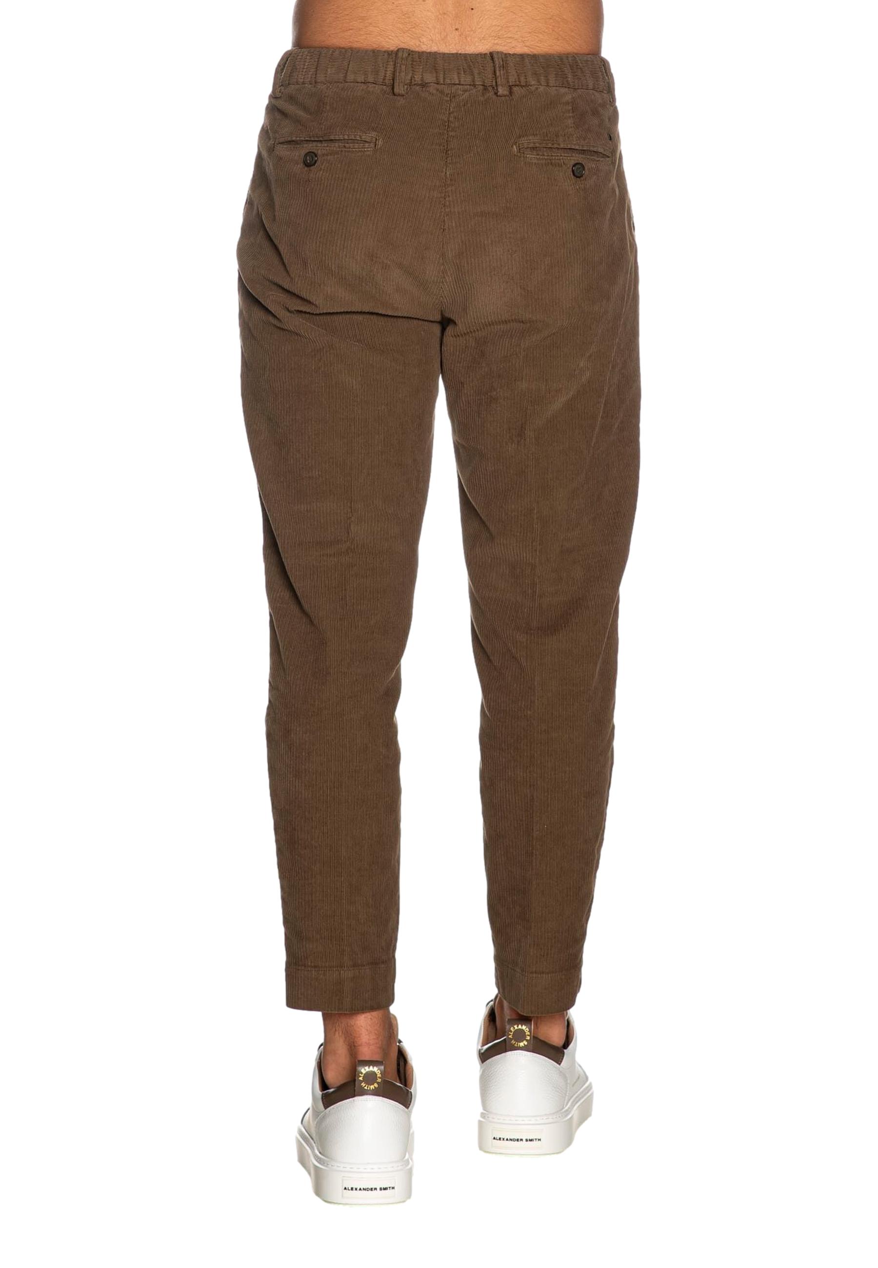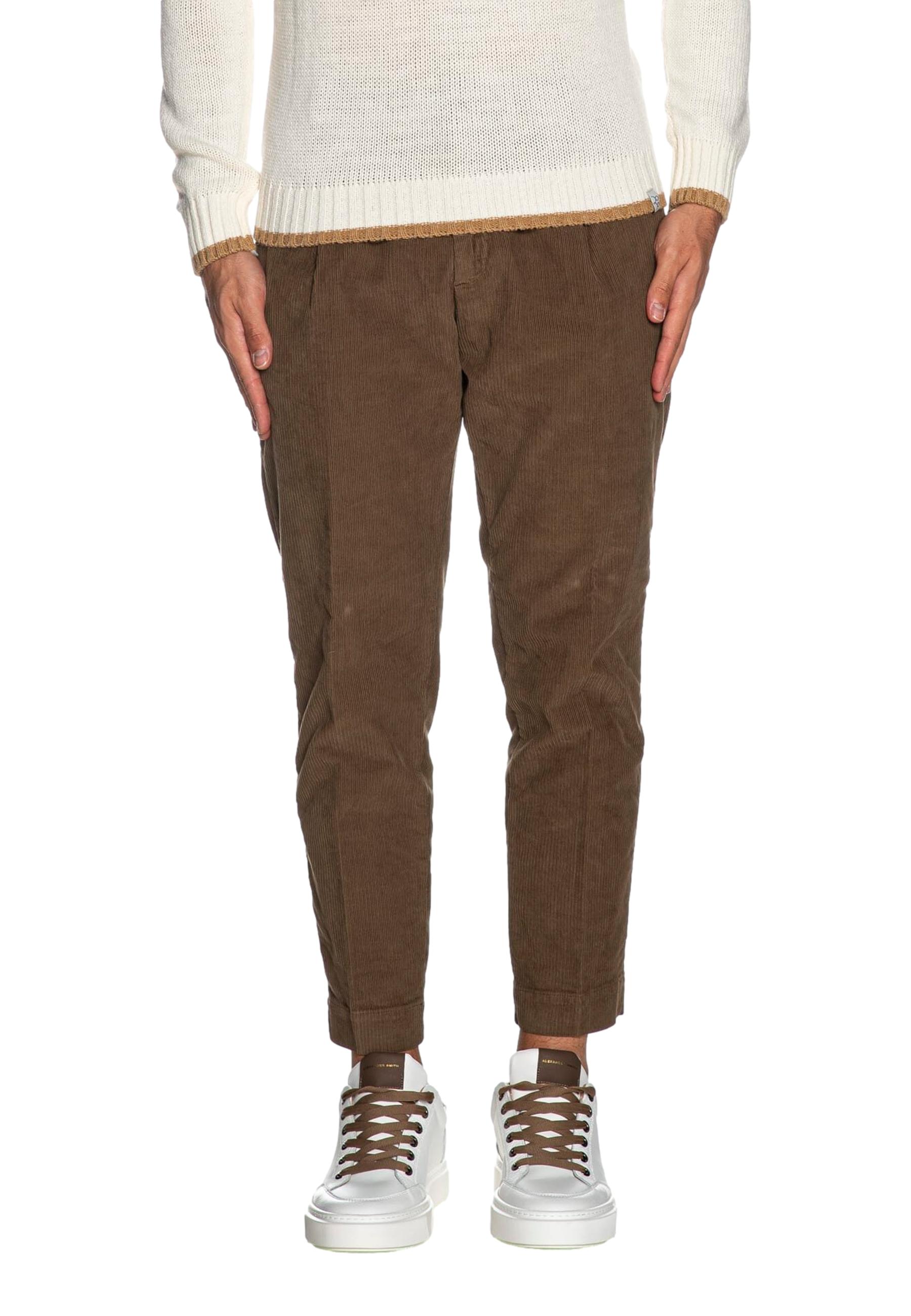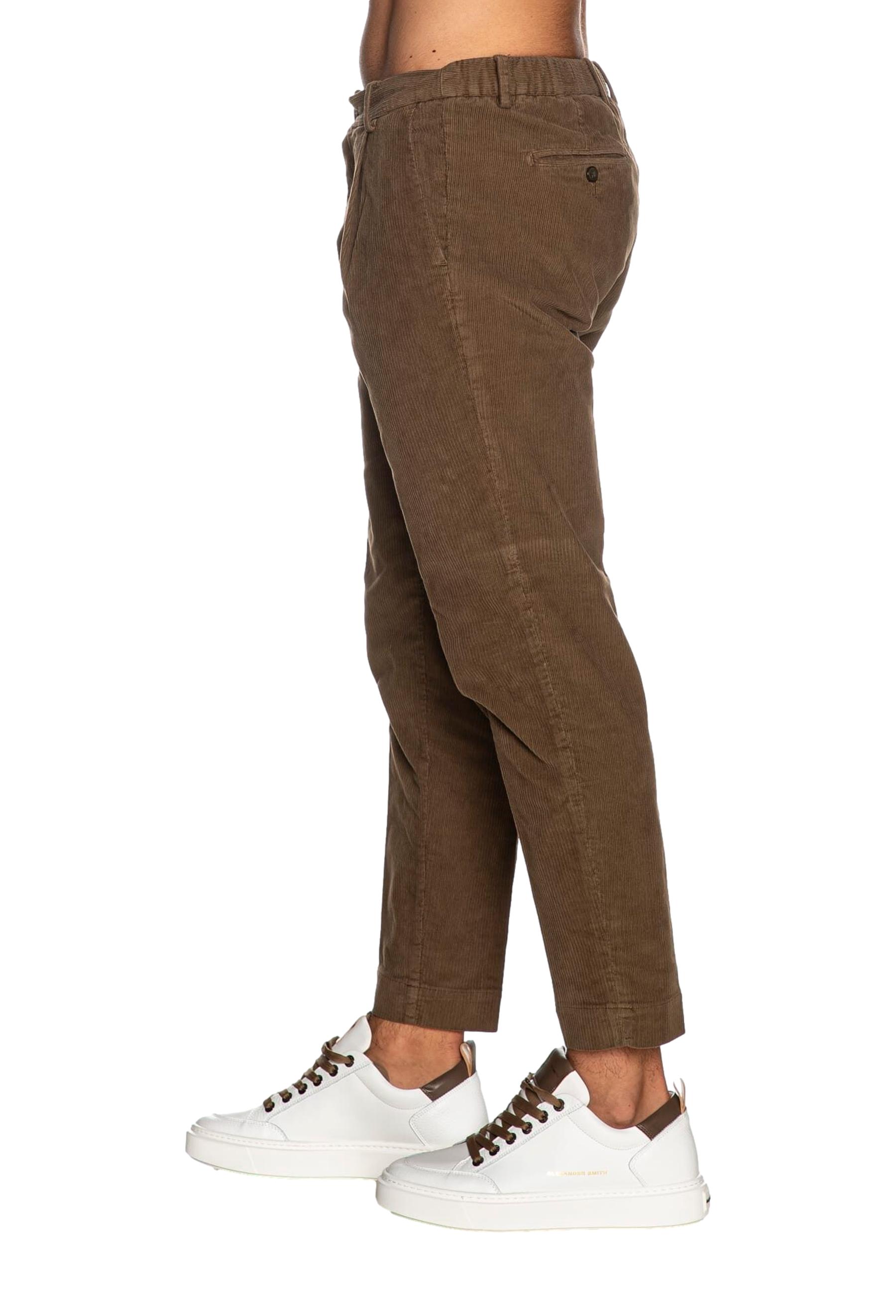 Pantalone Outfit da uomo in velluto a coste di cotone stretch, modello chino wide fit a gamba dritta ampia, con chiusura zip coperta ed elastico posteriore in vita, pinces anteriori, tasche laterali america, tasche posteriori a filo con bottone e micro monogramma smaltato applicato su un lato