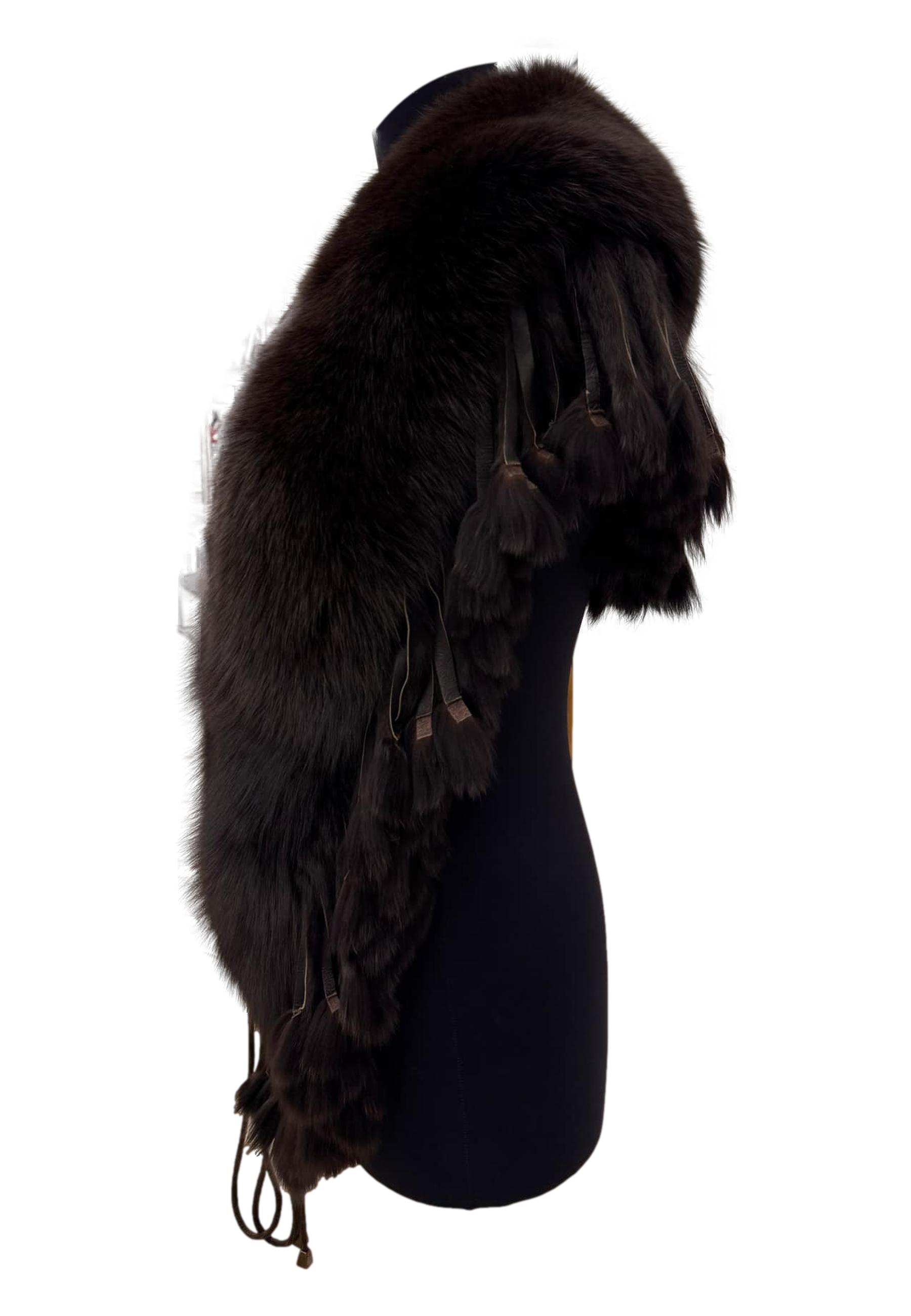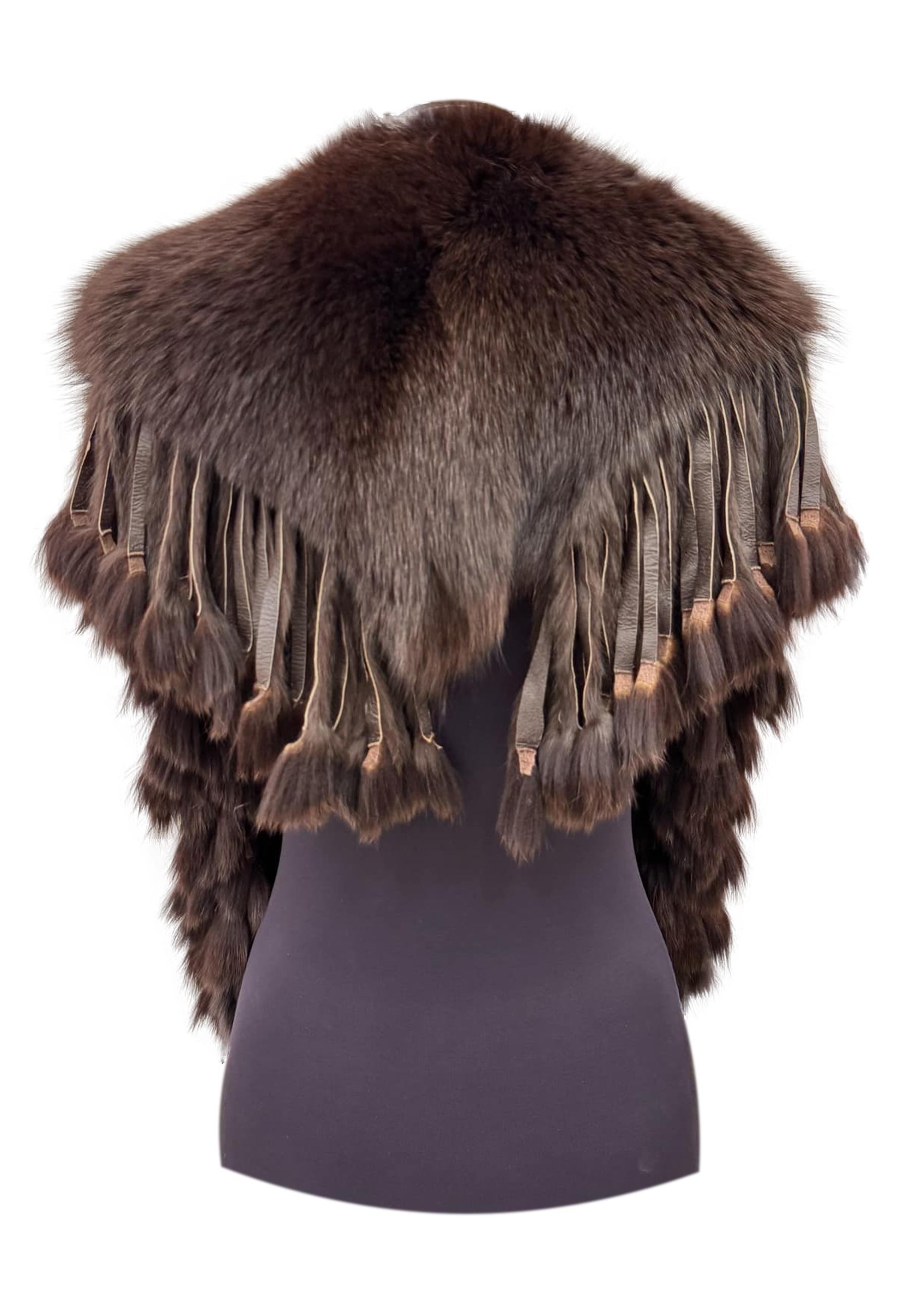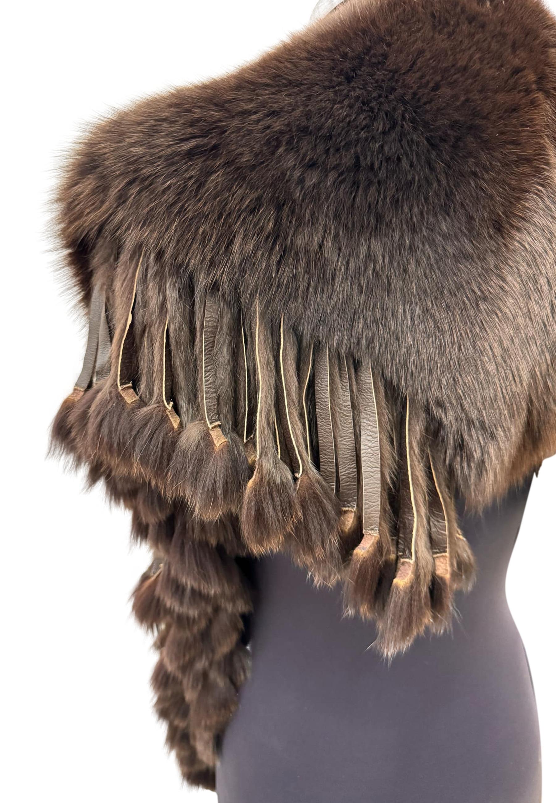 Stola di volpe con laccio sul davanti e bordatura di frange in pelliccia