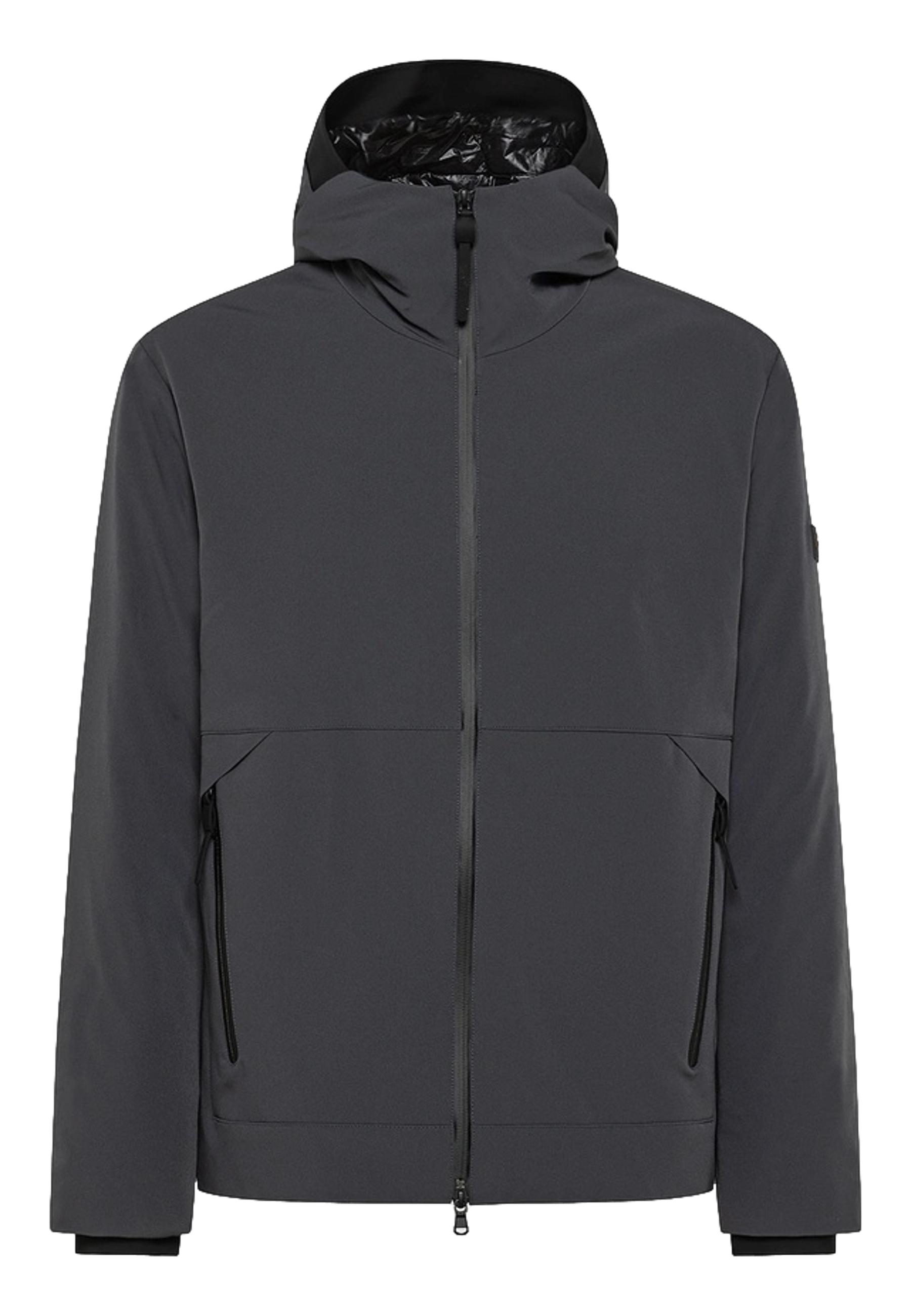 Bomber liscio in nylon elasticizzato accoppiato a un jersey di nylon soffice e caldo, con imbottitura in Primaloft. Full zip centrale nera spalmata, con doppio cursore, collo in piedi con profilo nero, tasche laterali e polsini antivento. Adatto alla mezza stagione, il modello è un mix perfetto tra la praticità della felpa e la finitezza del piumino.