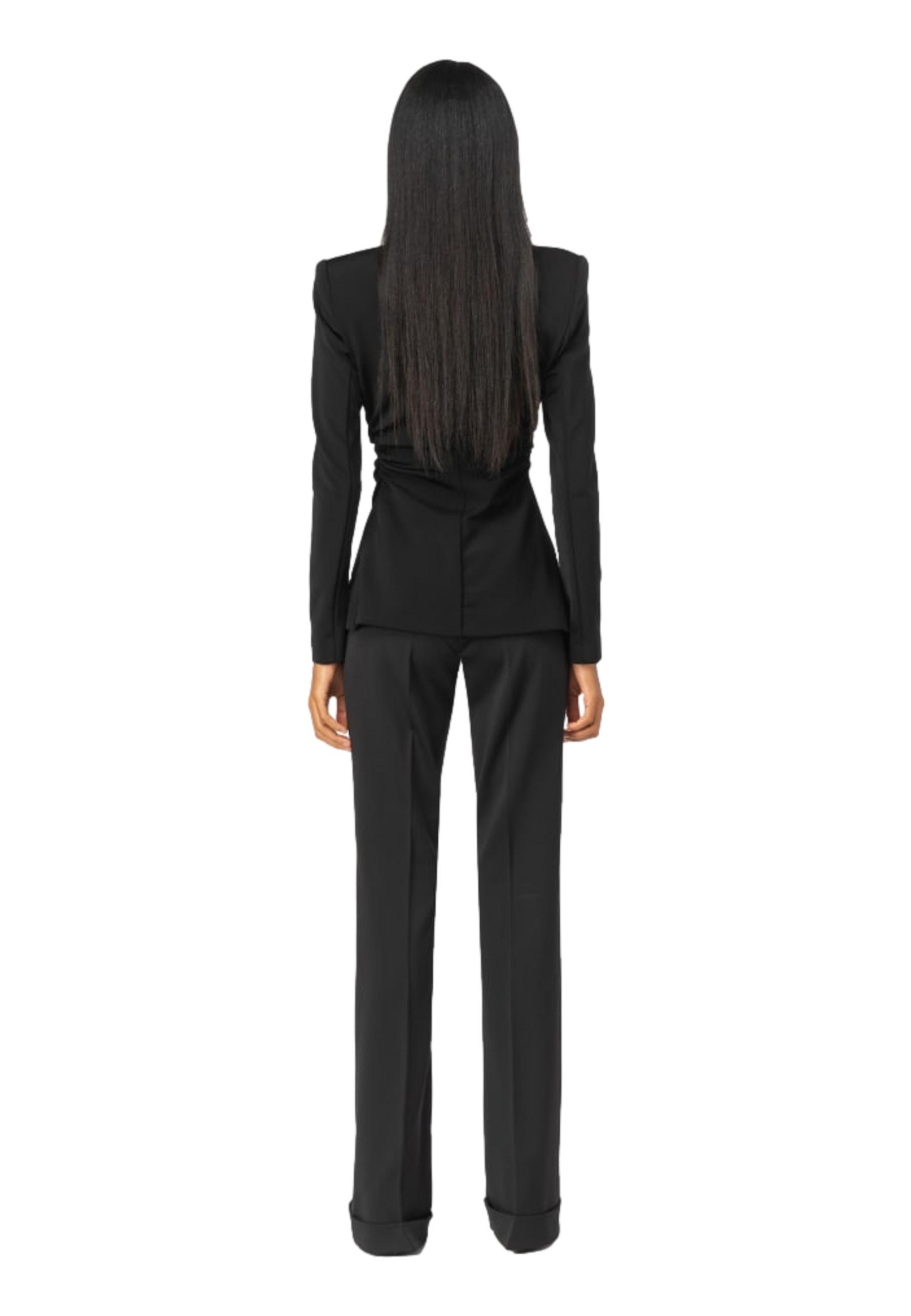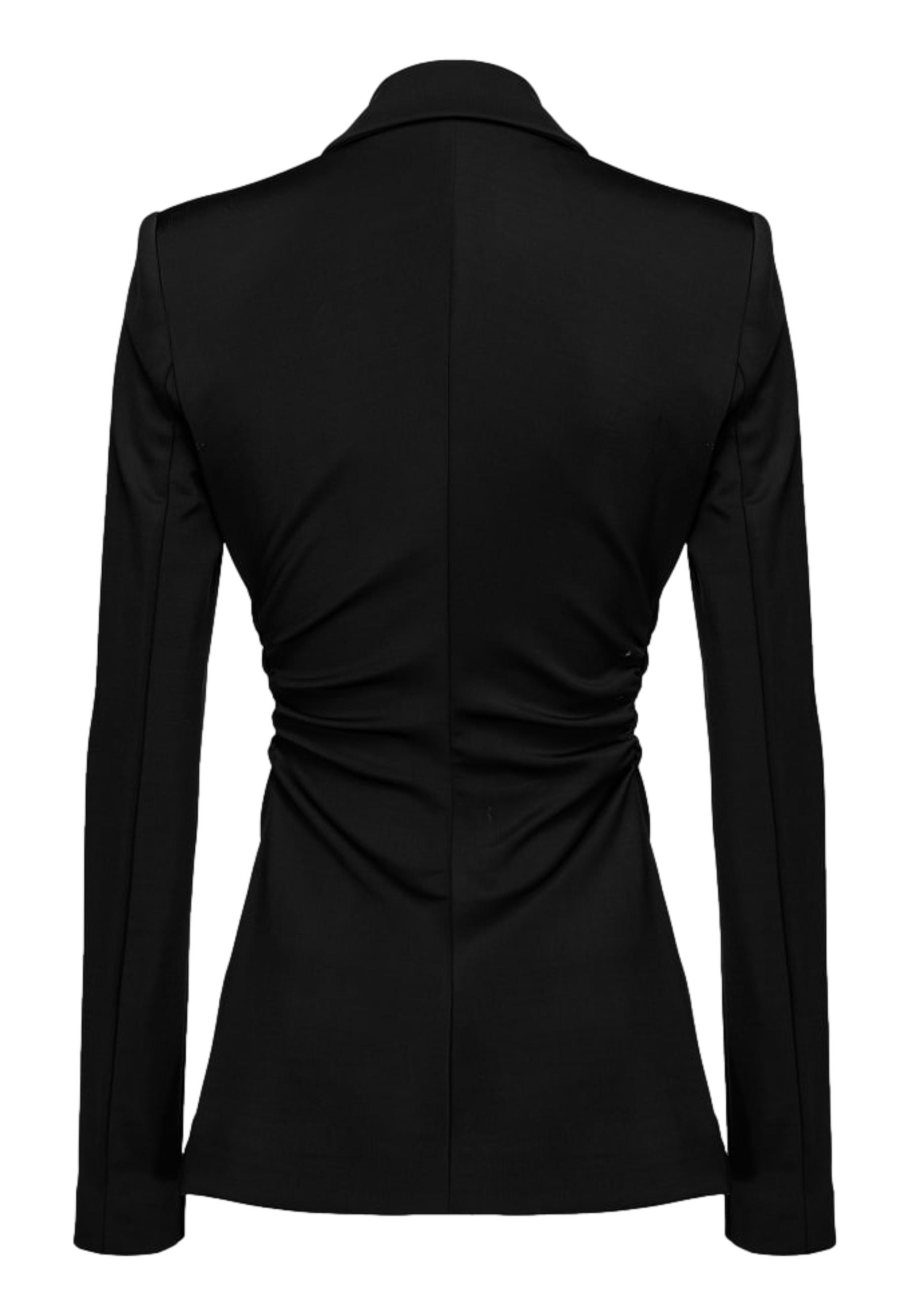 Blazer femminile dalla linea aderente sui fianchi in tessuto tecnico di viscosa stretch fluido effetto neoprene. Collo a rever, maniche lunghe aderenti, taschino a filetto davanti. Motivo di arriccio sui fianchi, dove la linea della giacca si fa aderente. Chiusura monopetto con bottoni davanti.