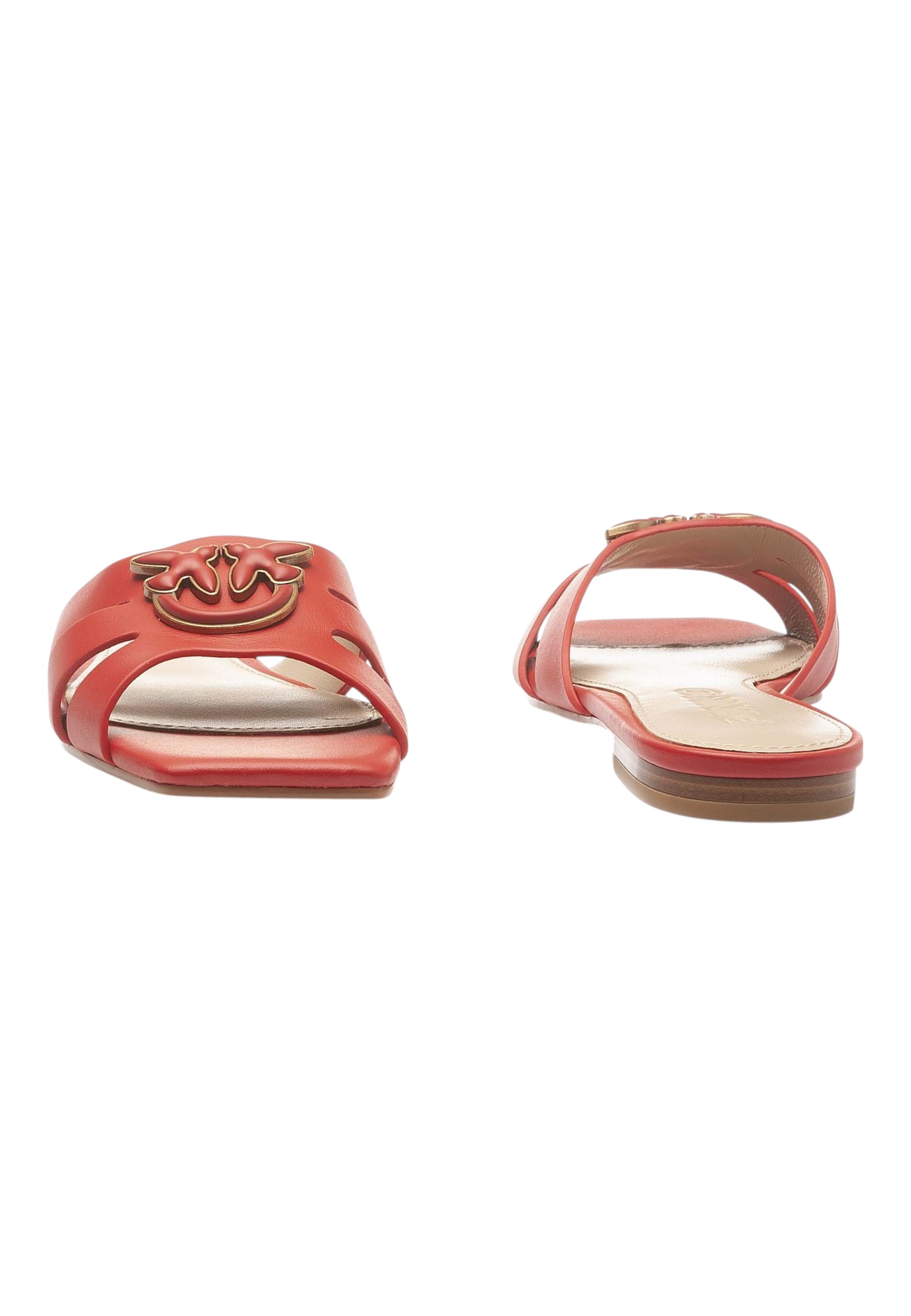 Sandali a ciabattina con tomaia costruita con fascette in morbida e pregiata nappa, personalizzati con accessorio logo uccellini Love Birds con inserto in nappa, nello stesso colore della scarpa. La suola è realizzata in tunit, un materiale sintetico con caratteristiche simili al cuoio, e comprende un piccolo tacco piatto. Le ciabattine sono la calzatura estiva per eccellenza, e sono perfette per qualsiasi occasione, con un vestitino o un paio di pantaloni.