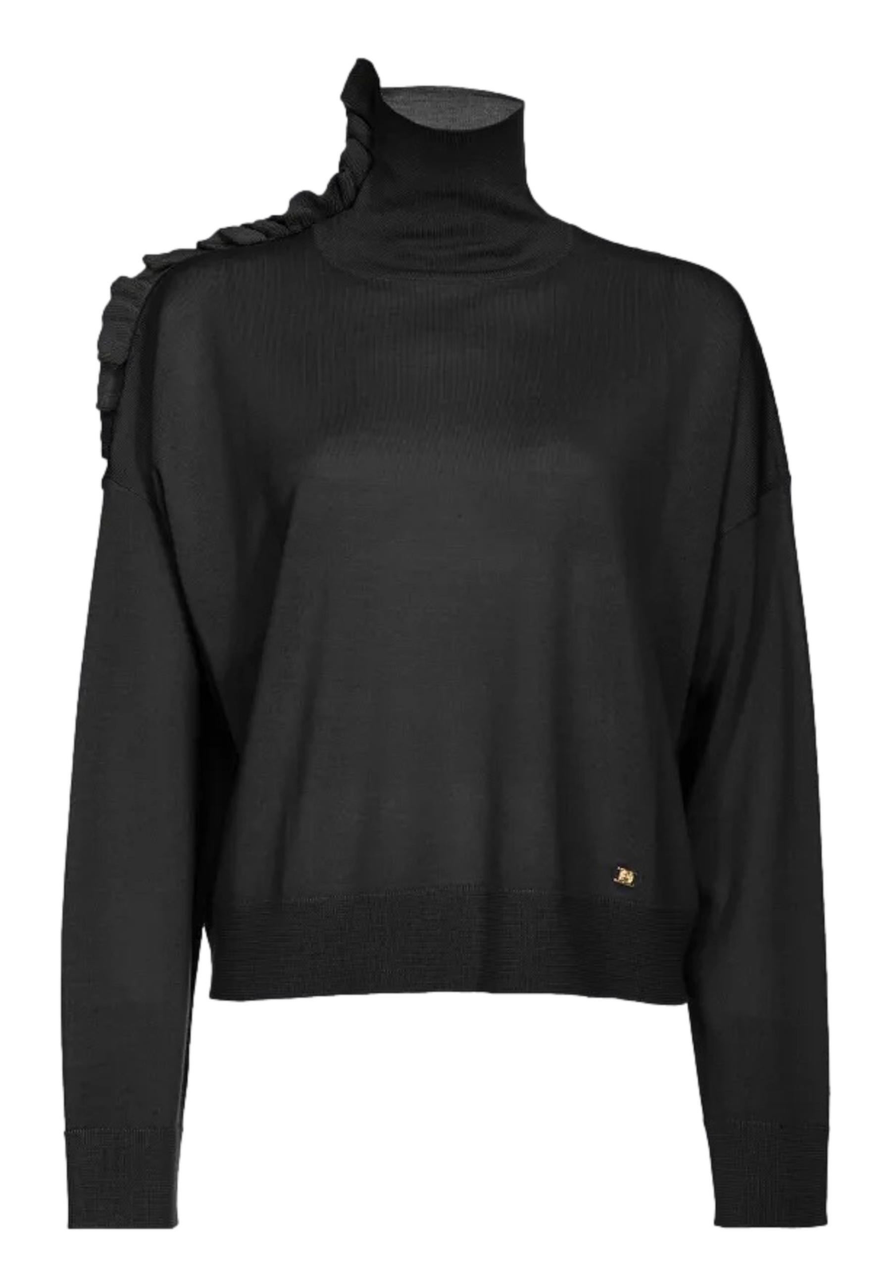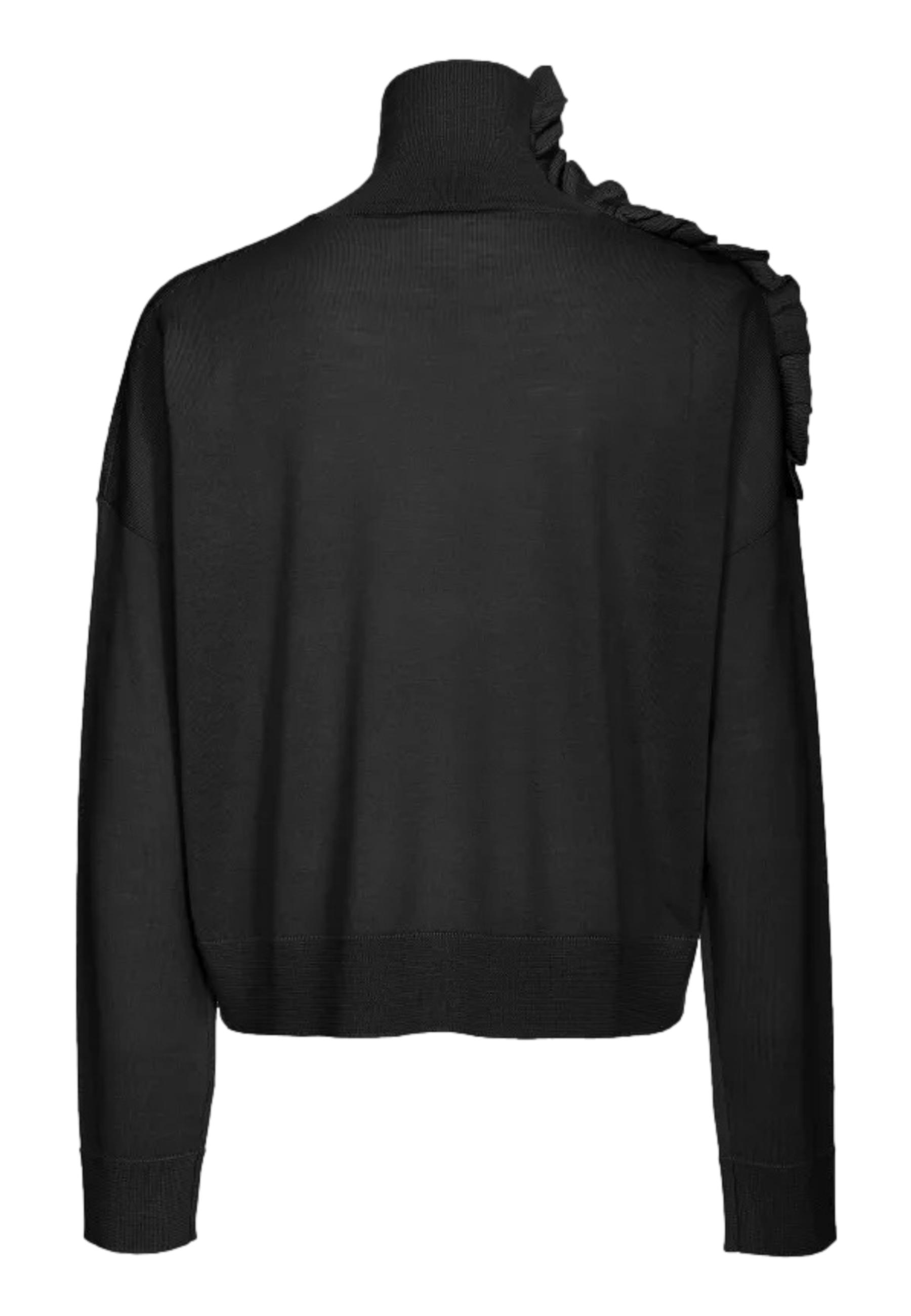 Dolcevita in maglia di pura lana caratterizzata da rouche laterale, che dal collo alto scende su una spalla. Volume morbido, con maniche lunghe a giro basso e personalizzazione con placchetta logo Love Birds in metallo a fondo capo.